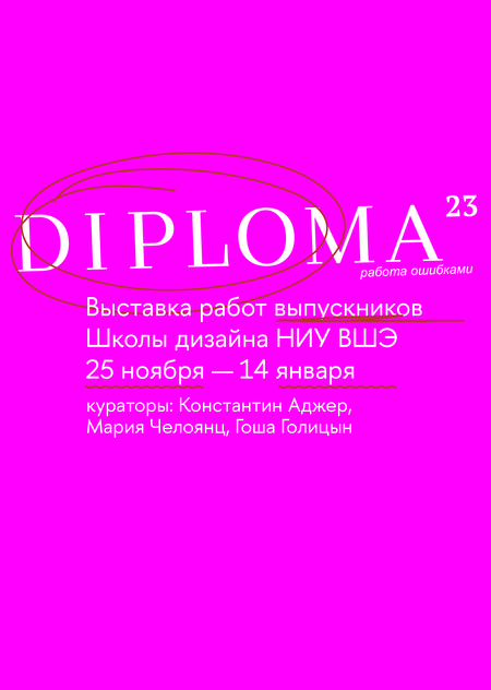 Diploma23 — это выставка дипломных проектов бакалаврского профиля «Дизайн и современное искусство» 2023 года в Школе дизайна НИУ ВШЭ. Самостоятельные художественные высказывания в контексте выставки объединены понятием «ошибка». Участники выставки принимают ошибки и неточности, несовпадения и несоответствия как важную часть конечного результата. Действуя не по правилам, они повышают ценность разнообразия и инаковости.
