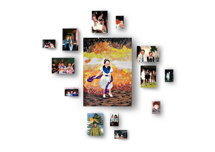 Promt 3: a small, worn, vintage-inspired photo album lying open on top of a second, slightly larger photo album in a bright, electric blue plasticine cover with the texture of a fingerprint and expressive strokes of vibrant, sunny yellow and hot pink paint, adorned with intricate, swirling patterns of golden filigree and delicate, lace-like florals, held by a gentle, aged hand with wrinkled fingers and a few forgotten rings, resting on the palm of the hand, on a worn, vintage-inspired wall with peeling paint in shades of turquoise and mint green, illuminated by a warm ray of light that filters through a nearby stained-glass window in shades of crimson and amber, a gentle haze, specks of dust in the light, surrounded by scattered Polaroids in bright, pop colors, lost buttons in iridescent hues, and faded postcards with colorful stamps, amidst old trunks, forgotten vases, empty picture frames, and a large, ornate clock, in a cozy, dimly lit attic, viewed from a low, diagonal angle, as if peeking up from the floor.
