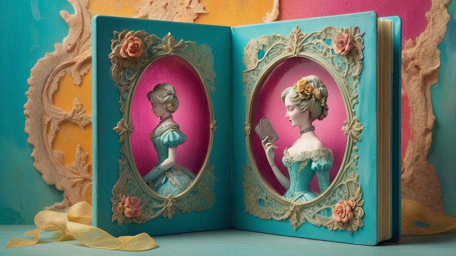 Promt 2: a refined, statuesque woman, reminiscent of a Victorian lady, holds a small, worn, vintage-inspired photo album in a bright, electric blue plasticine cover with the texture of a fingerprint and expressive strokes of vibrant, sunny yellow and hot pink paint, adorned with intricate, swirling patterns of golden filigree and delicate, lace-like florals, standing in front of a worn, vintage-inspired wall with peeling paint in shades of turquoise and mint green, illuminated by a warm ray of light that filters through a nearby stained-glass window in shades of crimson and amber, a gentle haze, specks of dust in the light, surrounded by scattered Polaroids in bright, pop colors, lost buttons in iridescent hues, and faded postcards with colorful stamps.