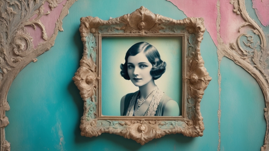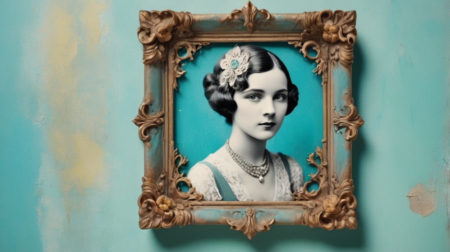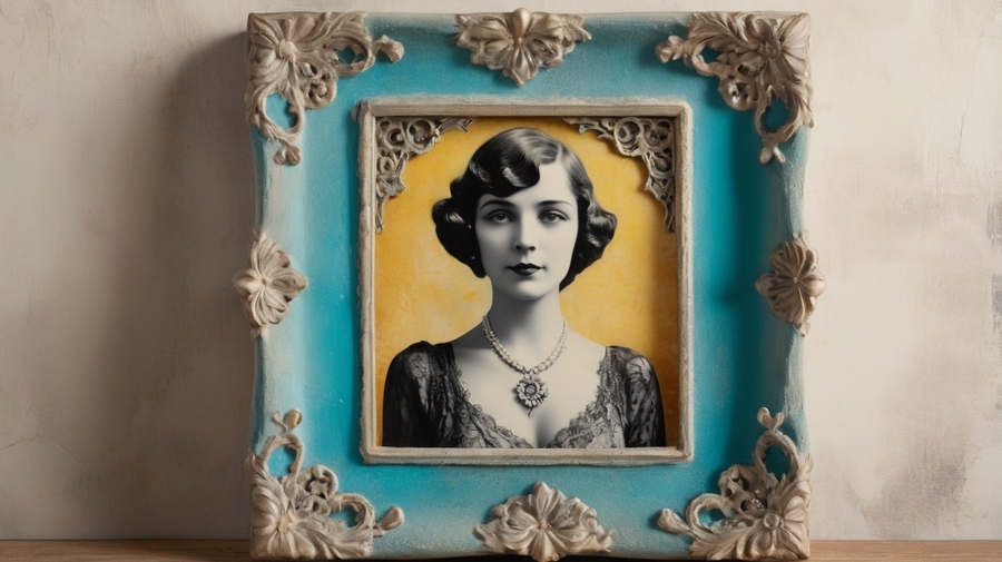 Promt 3: a worn, vintage-inspired wall with peeling paint in shades of turquoise and mint green, adorned with numerous, varied vintage photo frames of different shapes, sizes, and styles, each one unique and ornate in its own way, with the original frame, a small, exquisitely ornate, extremely worn, distressed vintage photo frame in a faded, electric blue plasticine cover, taking center stage, featuring intricate, swirling patterns of golden filigree and delicate, lace-like florals that appear to be hand-painted, holding a worn, black and white vintage photograph of a lady from the 1920s-1930s, illuminated by a warm ray of light that filters through a nearby stained-glass window in shades of crimson and amber.