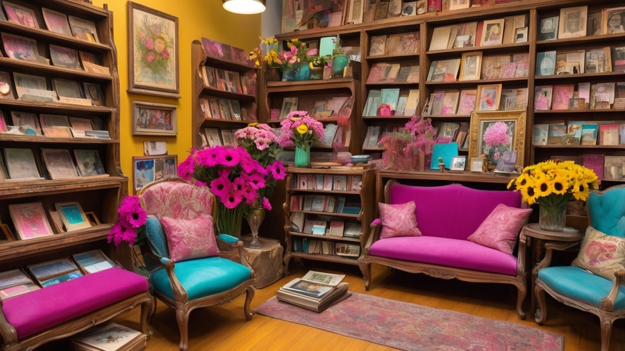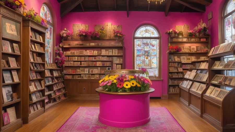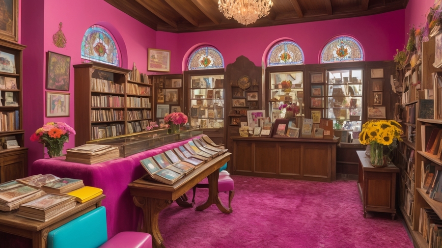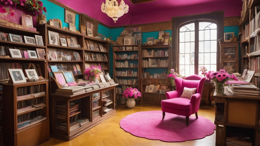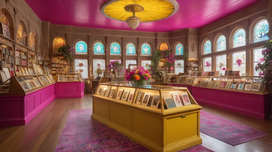 Promt 3: a small, worn, vintage-inspired photo album in a bright, fuchsia pink plasticine cover with the texture of a fingerprint and expressive strokes of vibrant, sunny yellow and hot pink paint, adorned with even more intricate, swirling patterns of golden filigree that dance across the cover, propped up against a worn, wooden shelf in a cozy, nostalgic store filled with customers browsing through vibrant, vintage photo albums in shades of bright magenta, turquoise, and gold. The air is filled with a lush arrangement of colorful flowers — daisies, sunflowers, and gerbera — and the shelves, stacked with old books, antique cameras, and ornate stands, stretch up to the high, vaulted ceiling. The store features multiple display windows, showcasing the owner’s treasures, and warm, vibrant light filters through the stained-glass windows, illuminating the bustling scene, which now includes a few customers sitting at a charming, flower-adorned table, surrounded by even more photo albums and curiosities.
