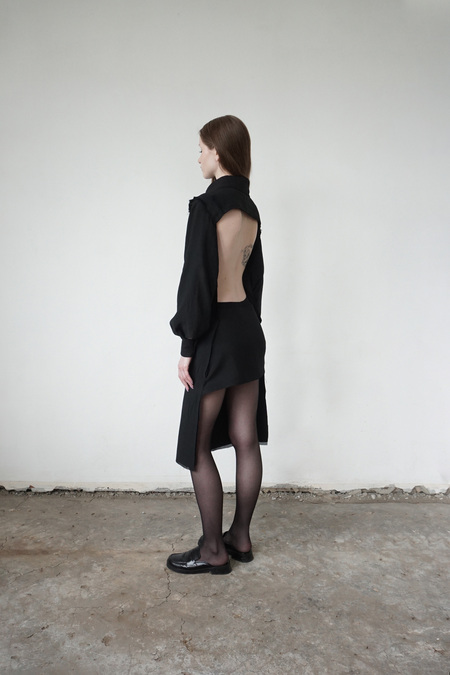 — В данном проекте одежда рассматривается как отражение опыта человека. Опыт вырывает из привычного мира навсегда не оставляя возможности полностью восстановиться после, человек оказывается в условиях из которых он не имеет возможности выбраться. Уплощение одежды как метафора сложных жизненных обстоятельств, из которых человек не может выбраться, ощущение того, что ты уперся в стену, без возможности выхода. с другой стороны форма обусловлена тем, как вещи хранятся в архивах музеев.