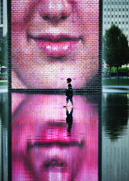«Crown Fountain» в Чикаго — динамичный арт-объект в общественном пространстве, который переосмысливает традиционное понятие фонтана. Он включает в себя две пятидесятифутовые стеклянные башни, на которых отображаются изображения лиц 1000 жителей Чикаго на LED-экранах. Лица периодически извергают воду изо рта, что говорит о сочетании искусства и технологии для создания пространства общественного взаимодействия и размышлений. Установка подчеркивает развивающийся диалог между людьми и общественными пространствами в 21 веке, акцентируя внимание на коммуникации и сочетании природных элементов с цифровыми технологиями.