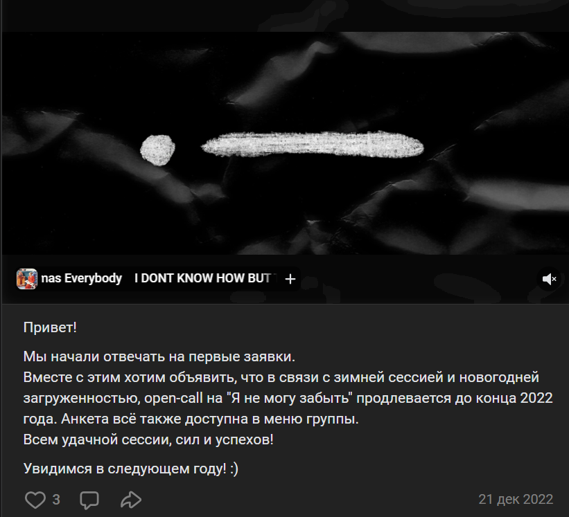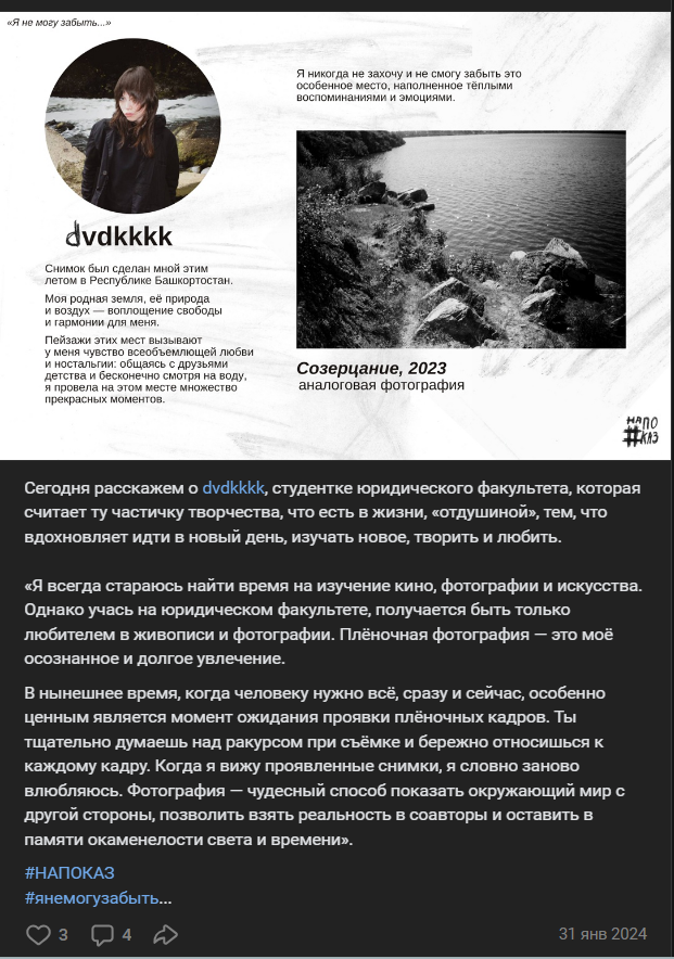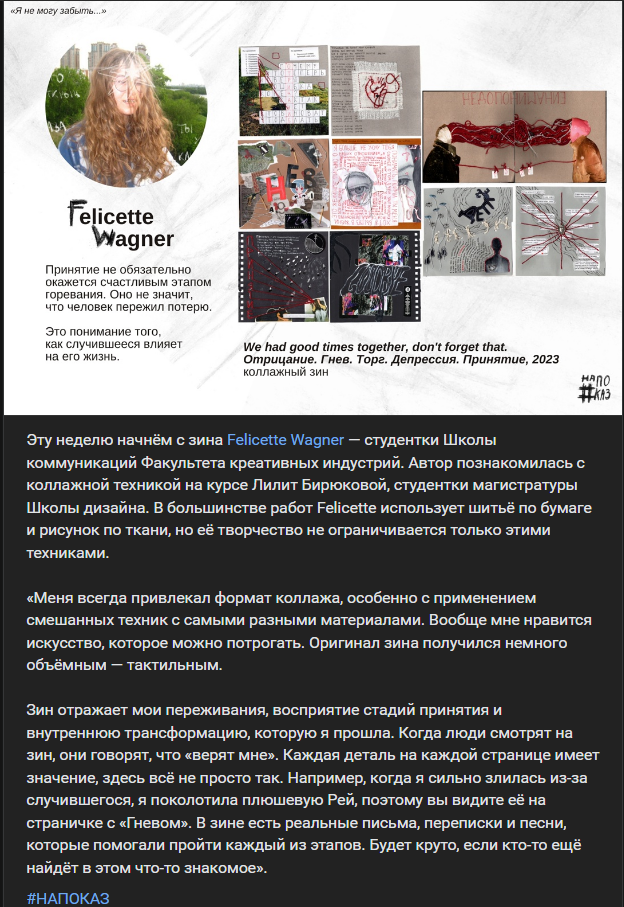 17 сентября, уже на первом курсе, я создала сообщество ВК и стала руководителем СО (студенческой организации) #НАПОКАЗ. СО придерживается концепции «творчества вне зависимости от образовательной программы и факультета».