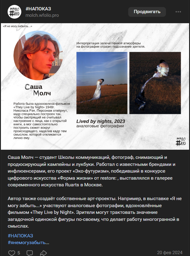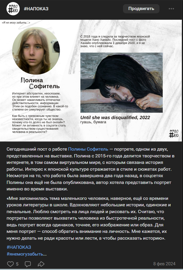 В сопровождении выставки вышли посты с карточками о работах, а также интервью с авторами.