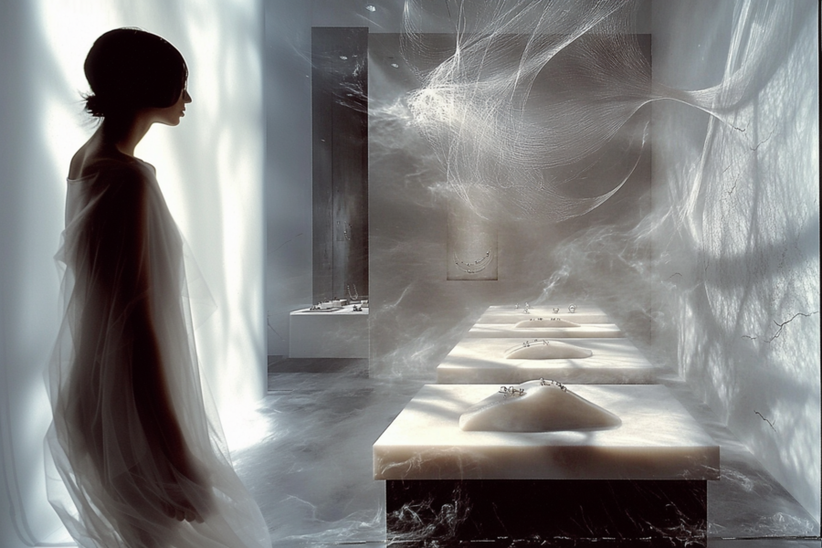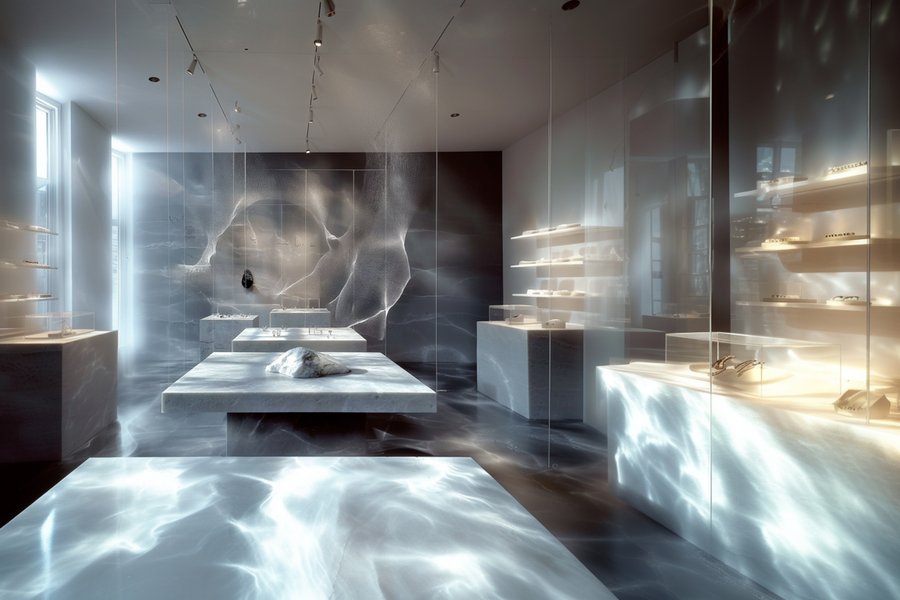 «A jewellery brand showcase, in light colours, much is made of glass and filled with light smoke, small smudges on surfaces»
