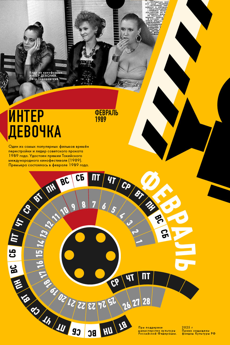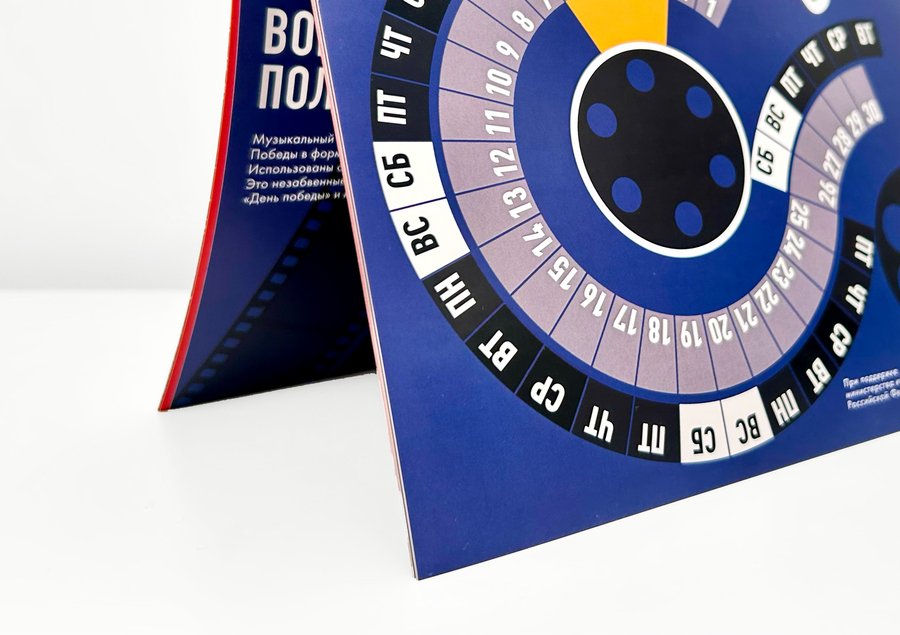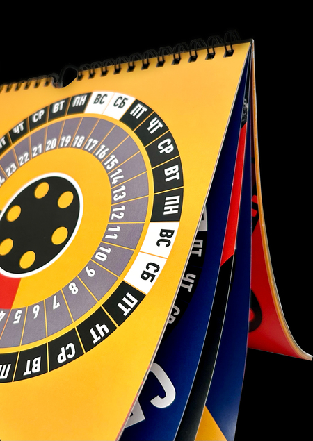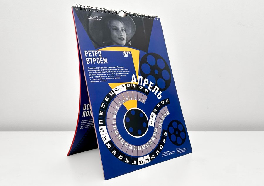 Каждая из страниц — своеобразный постер, собранный из знаковых образов киноиндустрии. Основная метафора календаря — кинолента, просвеченная лучом.