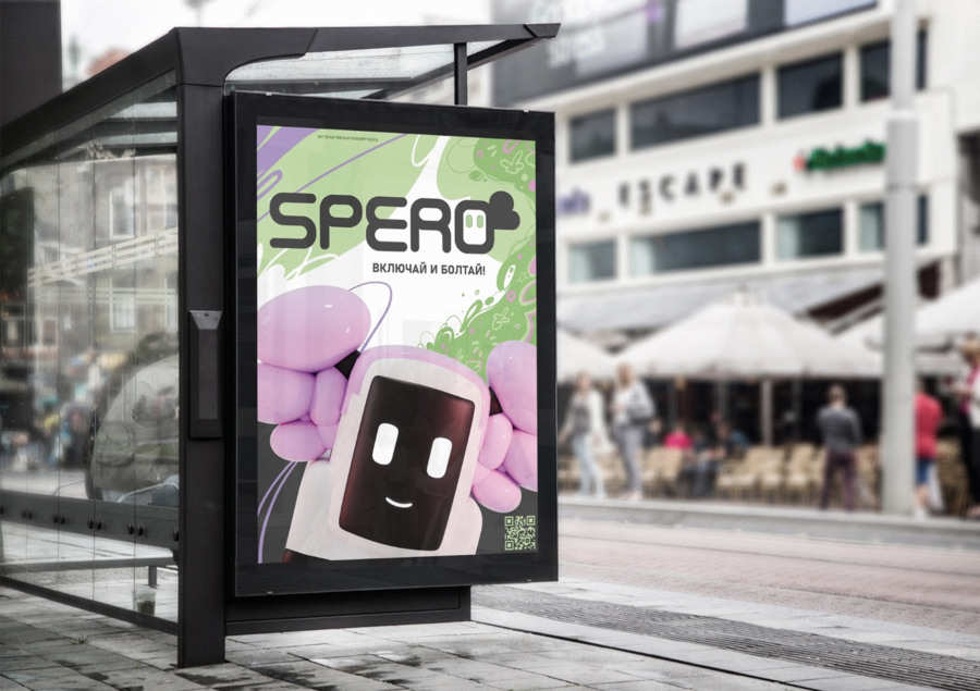 Описание проекта создано при помощи чата GPT по запросу: «Spero» Интерактивная робот-игрушка, тема бренда — дети, яркие неоновые цвета синий розовый, забавные символы: цветы, звезды