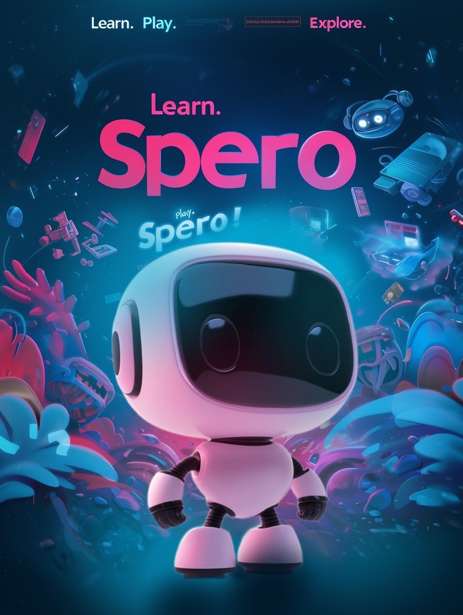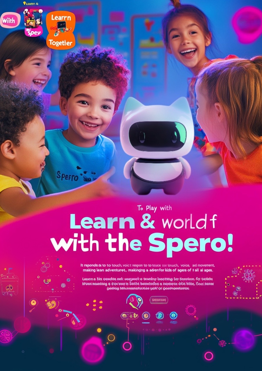 Prompt: * Image: A vibrant scene featuring a diverse group of children of different ages interacting with the Spero robot. Some kids might be using touch to activate the robot, others might be giving voice commands, and the robot might be shown moving or responding with lights and sounds. The scene should be dynamic and cheerful, set against a backdrop of stylized game elements and bright colors (neon pink and blue).