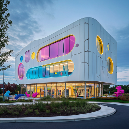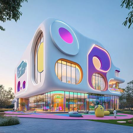 Prompt: Spero Building Exterior: A modern, rounded building with bright white walls, accented with neon pink and blue. Large interactive screens and dynamic LED lighting add a playful, futuristic touch. The building is surrounded by a child-friendly landscape, creating a fun, engaging, and innovative environment.