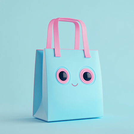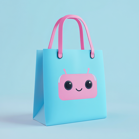 Prompt: the elegant shopper made of natural cotton has a minimalistic design. On it you will find the brand’s logo — a robot toy in bright light neon blue and pink colors. Illustration, product, 3d render.
