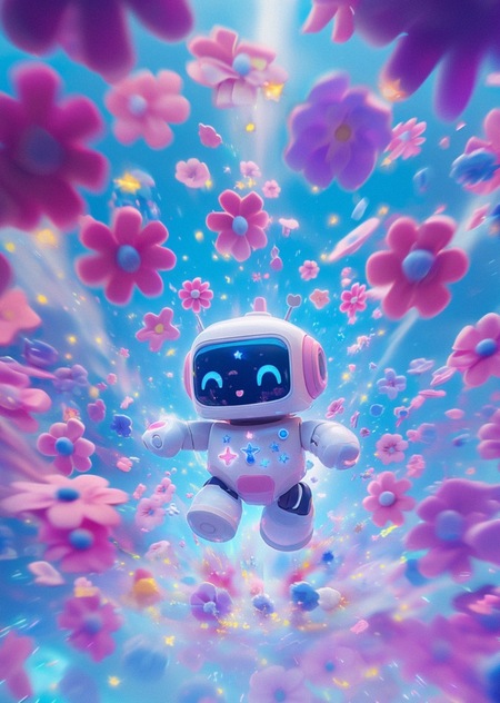Prompt: The cover is a burst of color and fun. A central image of the interactive robot toy is surrounded by a playful explosion of neon pink and blue flowers and stars. The robot itself is dynamically posed, perhaps mid-dance or with an excited expression. The background is a gradient of vibrant blues and pinks, creating a sense of movement and energy. The brand’s name is displayed in a large, child-friendly font, with some letters perhaps incorporating star or flower shapes. The overall feeling is whimsical, energetic, and immediately appealing to children. There might also be small icons that demonstrate the toy’s touch, voice and movement interactive capabilities.