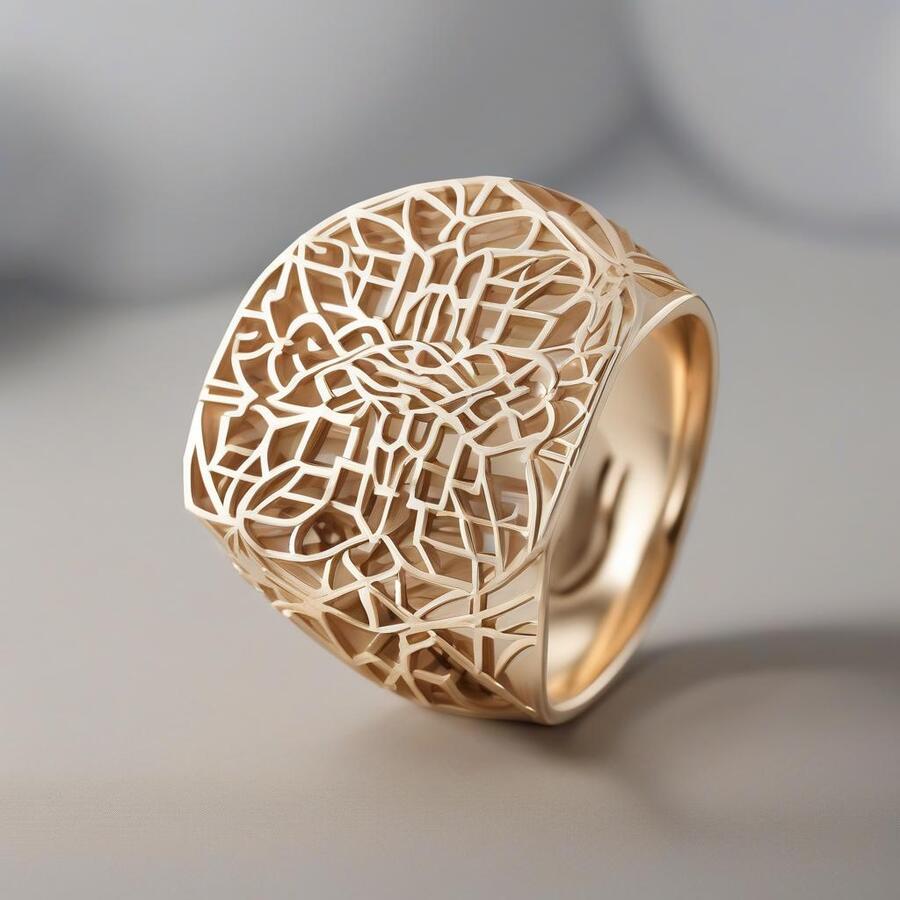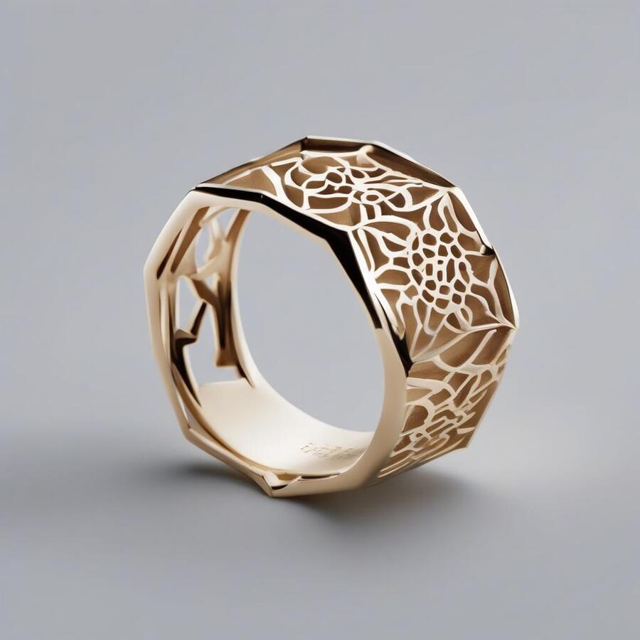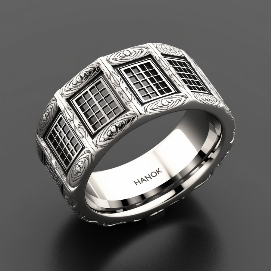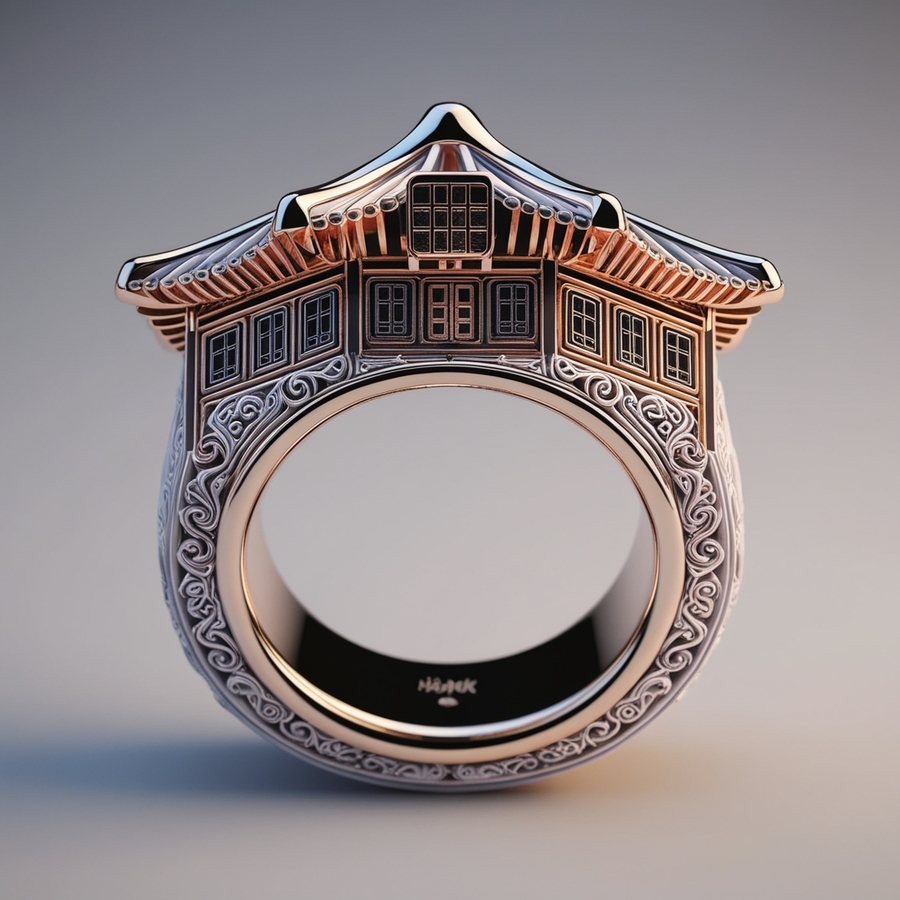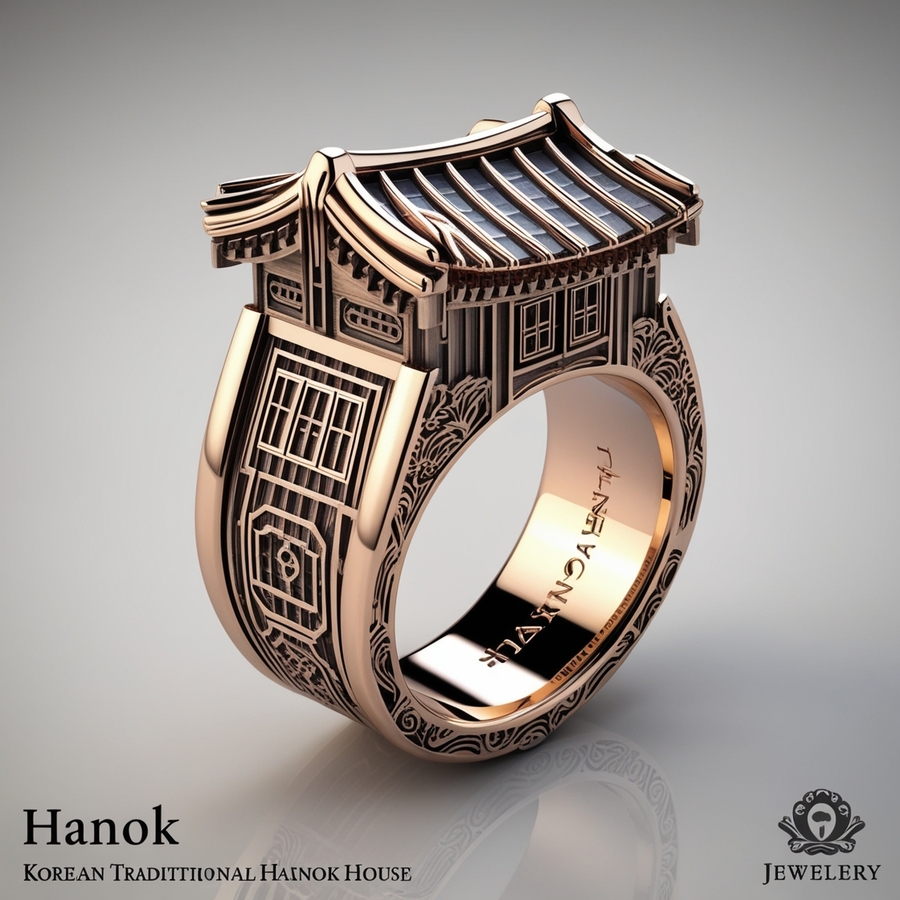 Промт: An exquisitely crafted 3D ring inspired by the intricate patterns found in a Korean traditional Hanok house. The ring mimics the delicate window and door patterns of the Hanok, showcasing a blend of cultural heritage and modern design. This stunning piece of jewelry captures the essence of Korean architecture in a unique and elegant way. The attention to detail is impeccable, with flawless craftsmanship and a truly mesmerizing aesthetic. This image is a digital rendering that showcases the ring’s intricate design in sharp, vivid detail.