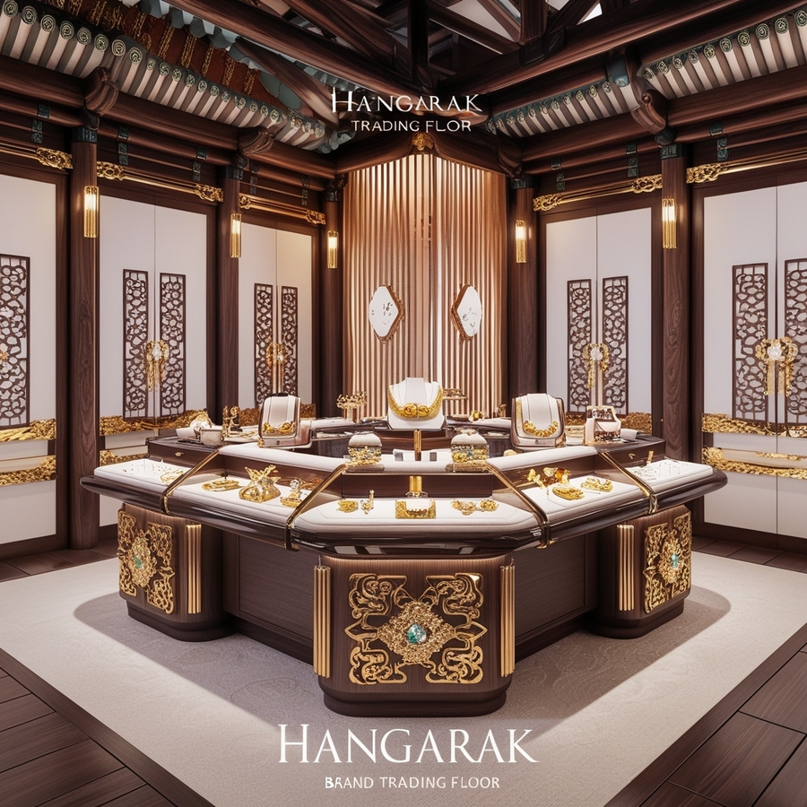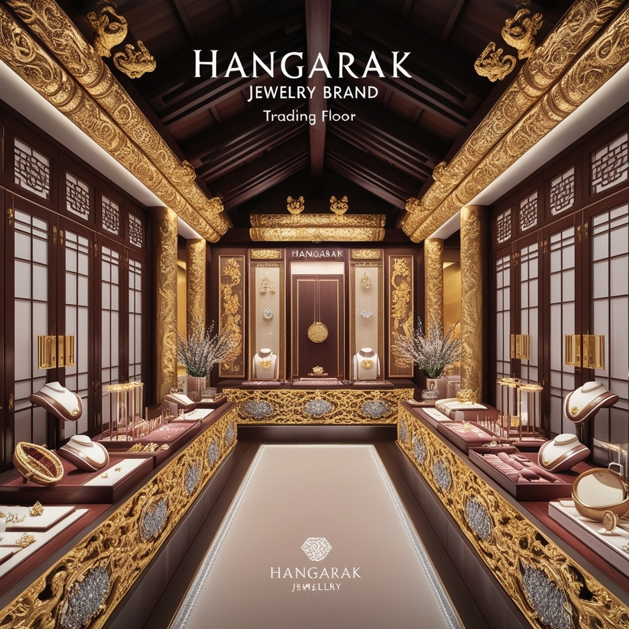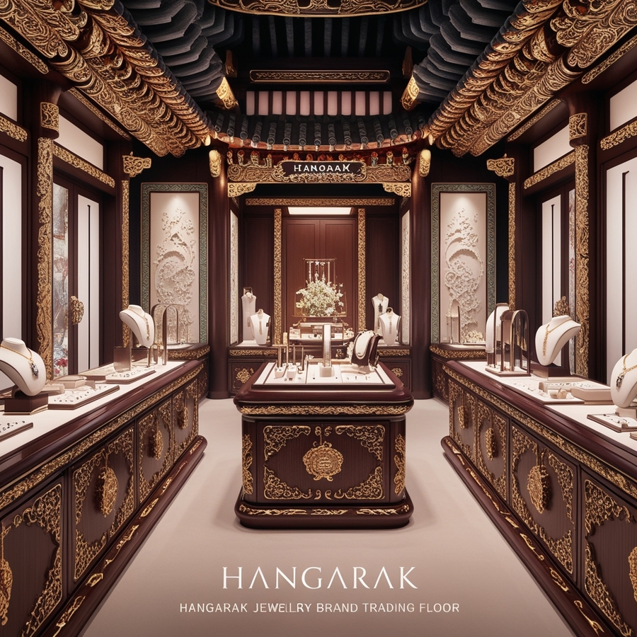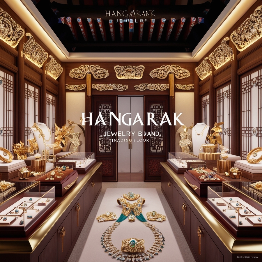 Промпт: A stunningly luxurious Hangarak jewelry brand trading floor, exuding Hanok atmosphere: intricately carved wooden panels, elegant paper doors, and traditional roof beams blending modernity with tradition. The image, a digitally rendered illustration, showcases opulent gold accents, shimmering gemstones, and exquisite craftsmanship, creating a mesmerizing visual feast. Impeccably detailed and richly textured, this image captures the essence of cultural fusion and refined elegance in a captivating and immersive way.