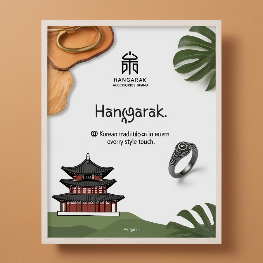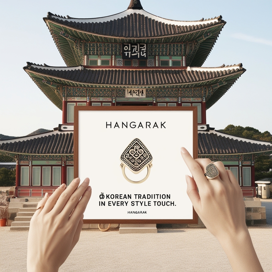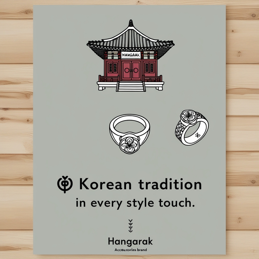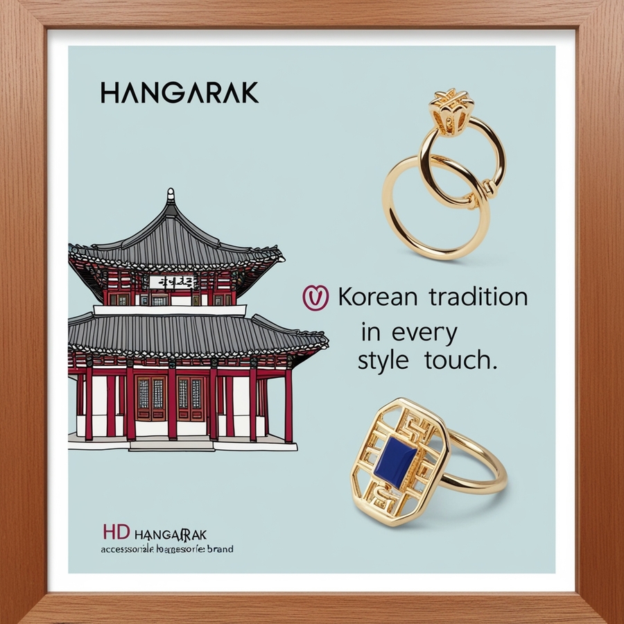Промпт: Create A póster in grafity HD brand Hangarak, Hangarak is an accessories brand inspired by traditional Korean Hanok (한옥) architecture. inside the poster write «한가락: Korean tradition in every style touch.». In the poster, draw Hanok and a Hanok-style ring.