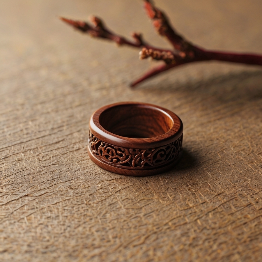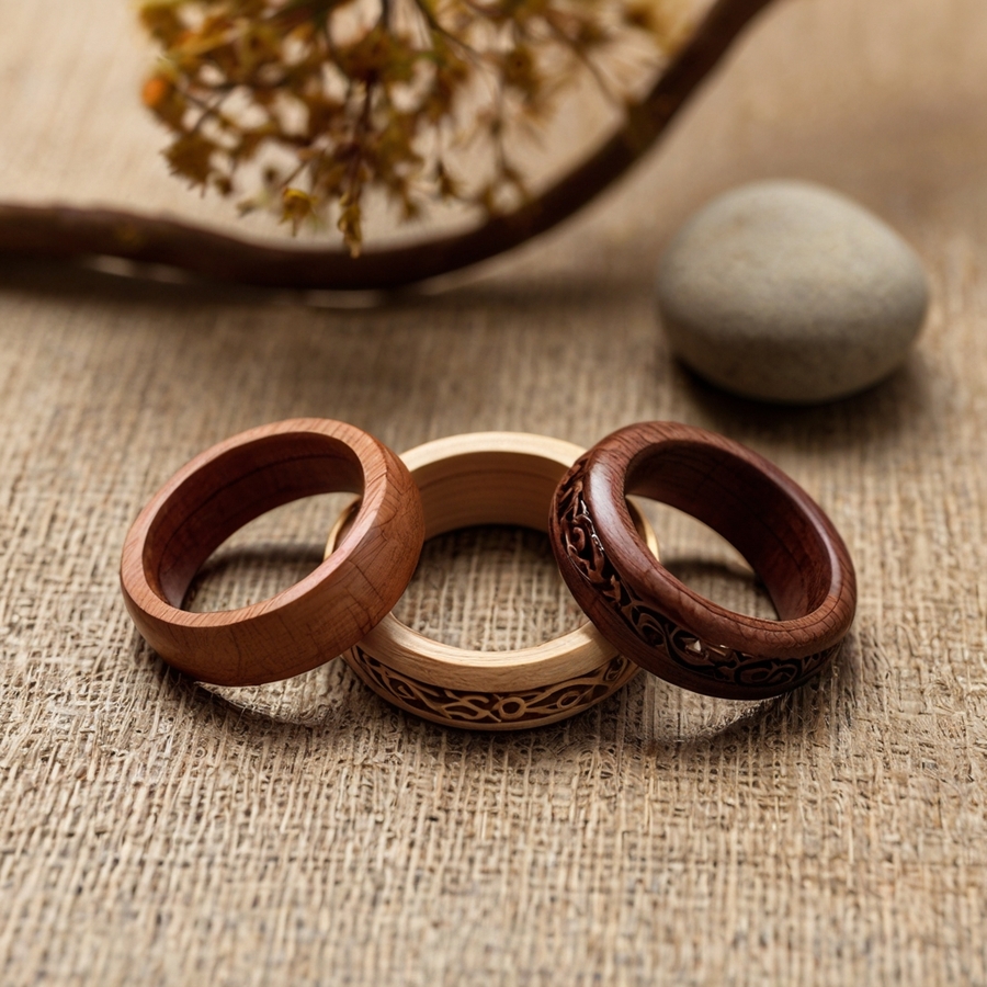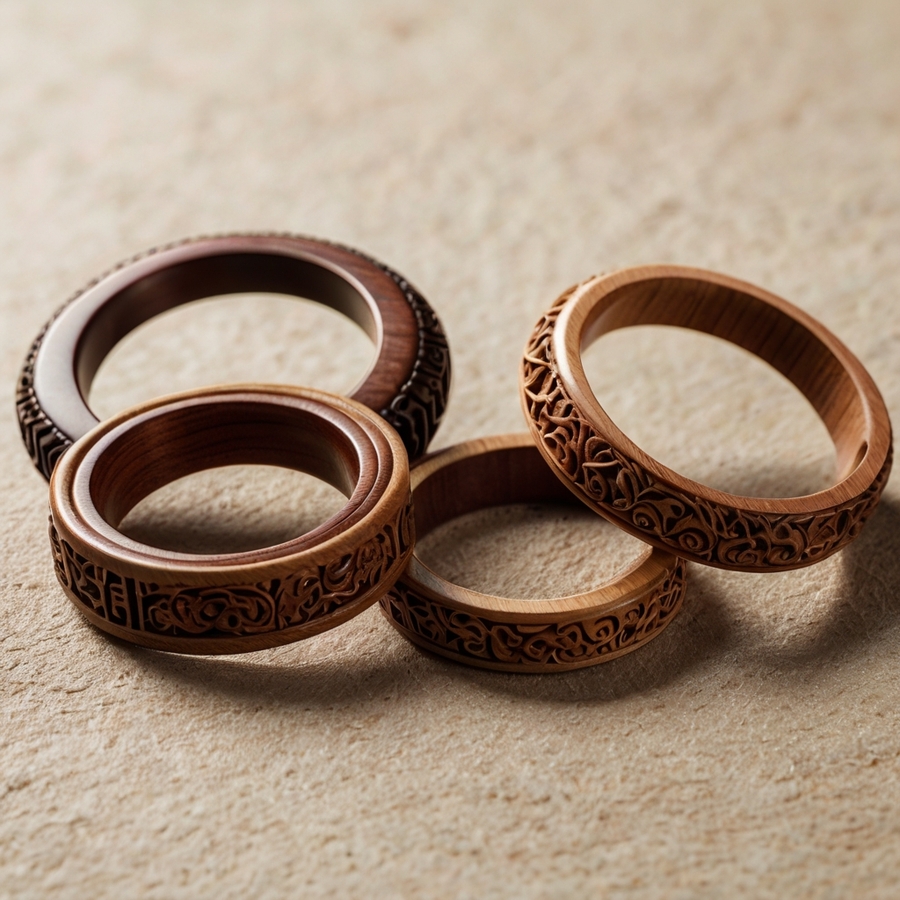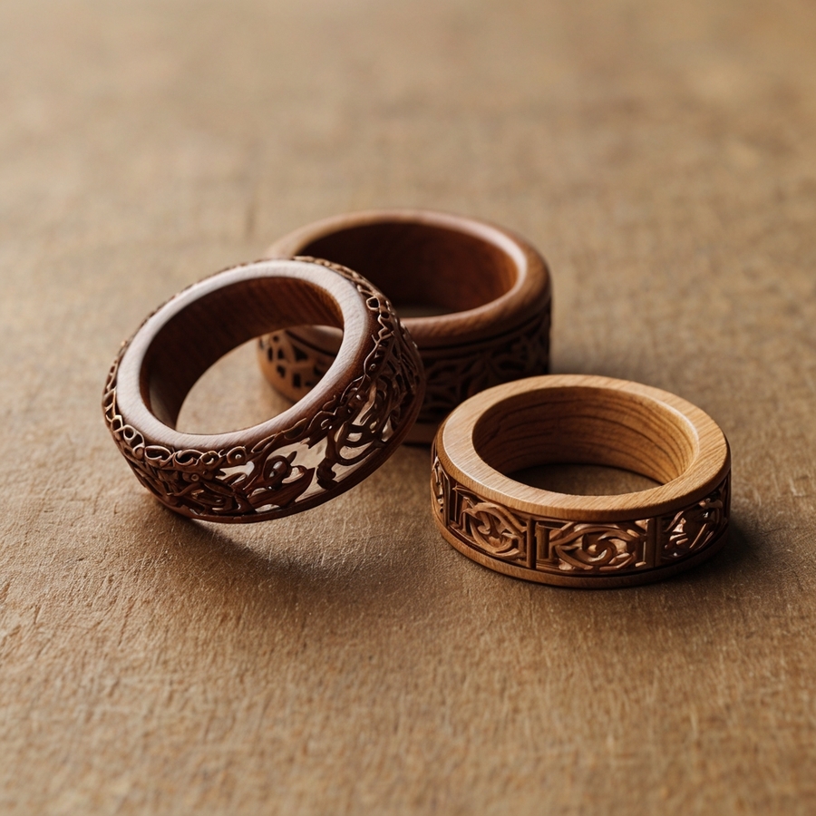 Промпт: Crafted with meticulous detail, each wooden ring in this pack exudes the essence of a traditional Korean house. The main subject of this image is a set of wooden rings meant to be worn, inspired by the architectural beauty of Korean homes. This digital rendering showcases the rings in stunning clarity, highlighting the intricate carvings and delicate patterns reminiscent of Korean craftsmanship. Rich mahogany tones and intricate designs make these rings a true work of art, perfect for anyone seeking to adorn themselves with a piece of cultural history.