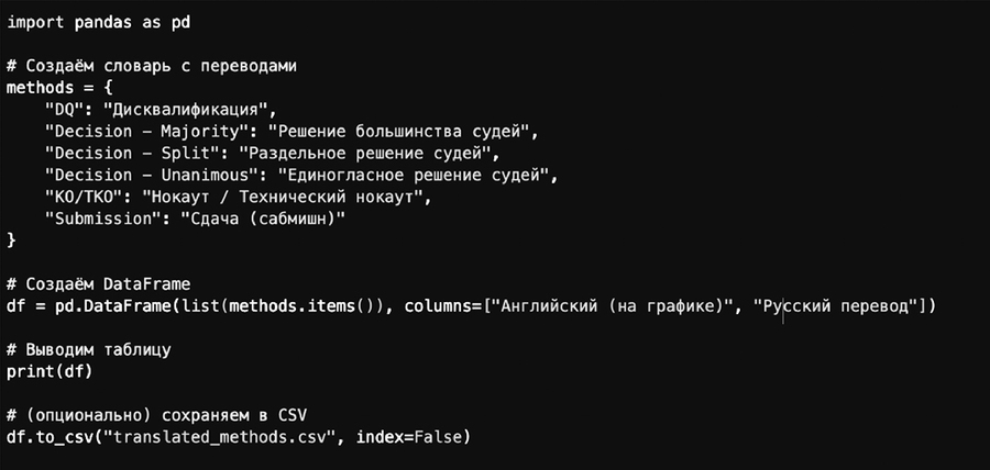 Сначала нужно загрузить и преобразовать открытые данные из объединённых таблиц UFC — merged_stats_n_scorecards.csv, содержащие информацию о более чем тысяче боёв: имена бойцов, исходы, раунды, веса, категории, методы побед и т. д.