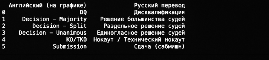 Что мы видим на графике: В первых двух раундах преобладают досрочные победы (особенно KO/TKO и Submission). В третьем раунде резко возрастает доля побед по решению судей — особенно Unanimous Decision. 4 и 5 раунды встречаются реже (меньше боёв, т. к. многие — не титульные), но тоже чаще заканчиваются решением, нежели досрочно. DQ (дисквалификация) — крайне редкий способ победы.