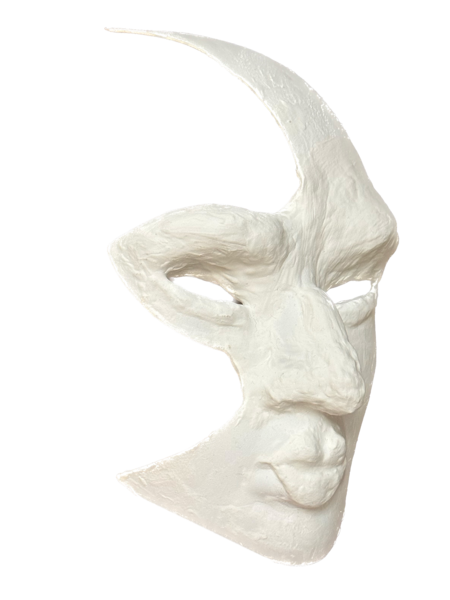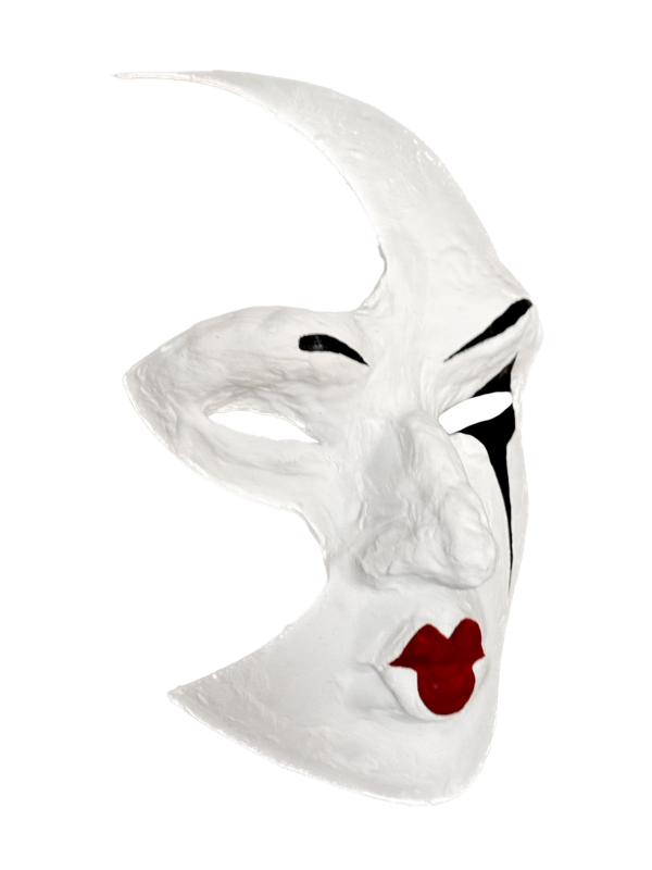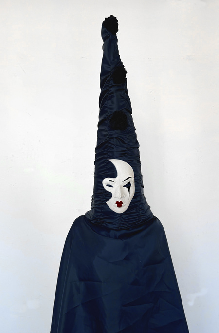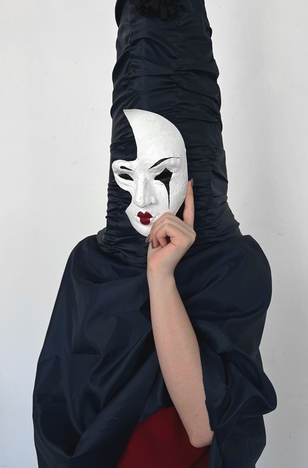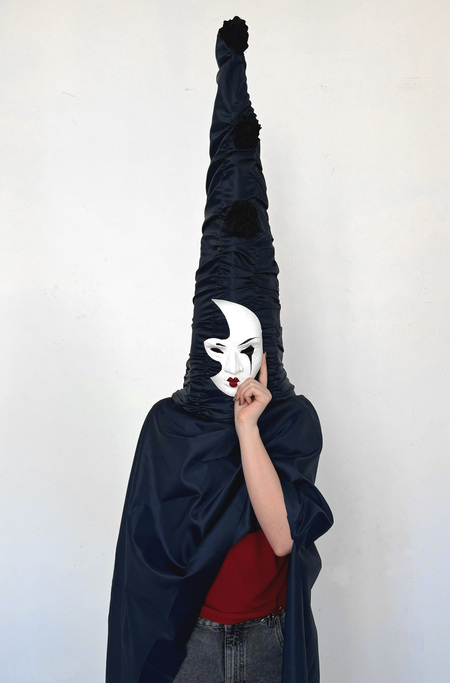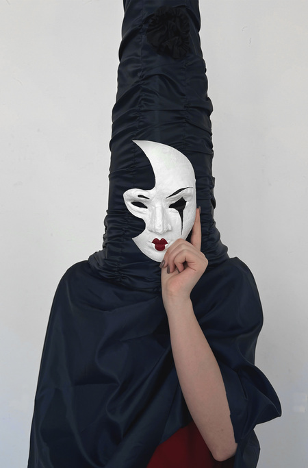 Мотивом для головного убора послужил цирк. Главным референсом стал колпак Пьеро. Фактура убора повторяет драпировки занавеса, а темные глубокие оттенки навевают флер мистерии, загадки, неоднозначности. Складки темного текстиля контрастируют с текстурой маски, которая коррелирует с цирковым гримом. Через разрезы маски не видно глаз, так как они являются зеркалом души, а в цирке все играют роли, скрытые под слоем грима и костюмов.