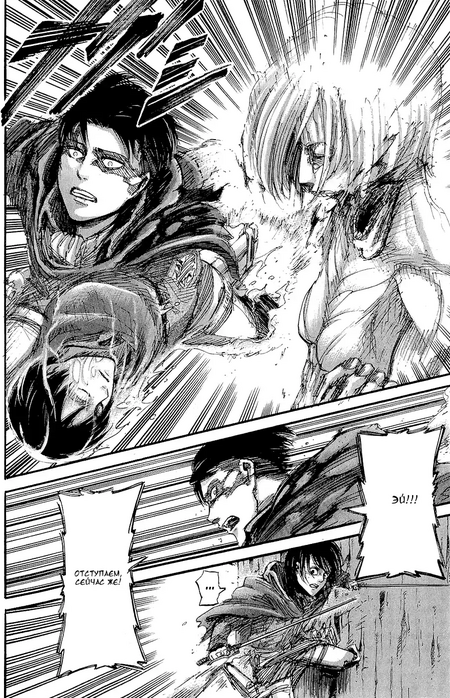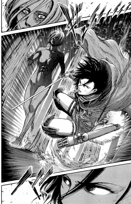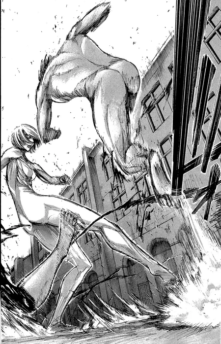 И если ракурс снизу-вверх для читателя и персонажа говорит о бессилии и жалости, то ракурс сверху-вниз используется, чтобы показать побежденного титана, над которым бесстрашно и озверело возвышается человек.