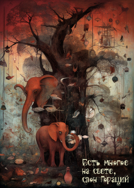 Гораций (Хорас) — азиатский слон, живущий в Киевском зоопарке с 2012 года. Для производства иллюстраций использовалась MidJourney 5.1, дообученная на рисунках Янины Вишневской (сухая пастель, уголь, маркеры, линёры).