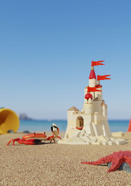 Моя композиция построена вокруг стилизованного песочного замка, который находится на берегу моря. Его окружают обитатели пляжа: крабы, морские звезды, рачки, спрятавшиеся в ракушках.
