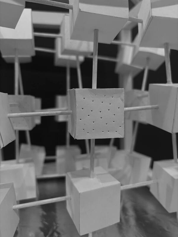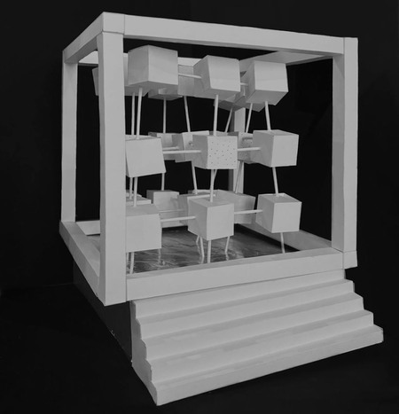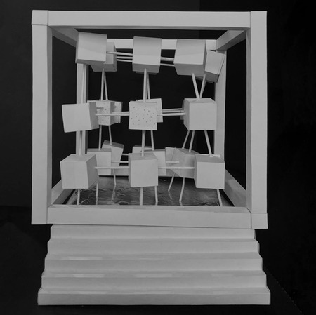 Макет арт-объекта «Формула белого» на основе теорий Иоганнеса Иттена о цветах и их контрастах. Макет состоит из 27 кубиков, соединенных между собой. Для создания акцента и эффекта наличия цвета на центральных кубиках создана фактура. Она также помогает добавить некой прозрачности фигурам.