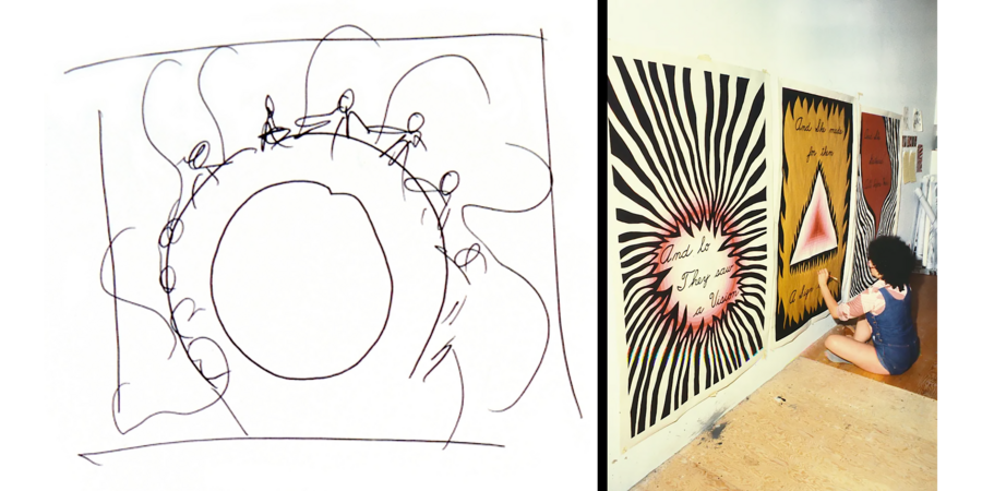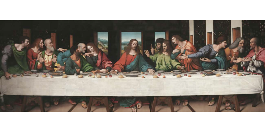 Джуди Чикаго, Званный ужин/ Пир, 1974–1979 гг. Джуди Чикаго, Первый набросок Званного ужина, 1974 г. Джуди Чикаго рисует баннеры Званого ужина, 1978 г. Леонардо да Винчи, Тайная вечеря, 1495–1498 гг.
