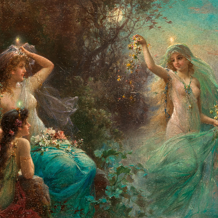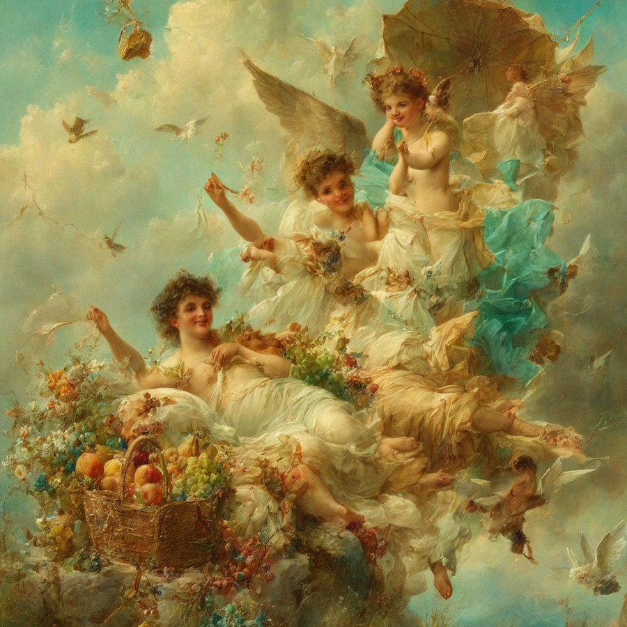 1. painting by Hans Zatzka, one angel enjoying a picnic on a cloud, with a checkered blanket, a basket of fruits, and a kite soaring above them 2. painting by Hans Zatzka, water nymph emerging from a pond, holding a clay pitcher filled with spring water, as she greets a traveler resting beneath a willow tree 3. painting by Hans Zatzka, woman playing a harp under the moonlight, her music attracting a flock of fireflies and a curious deer from the nearby woods