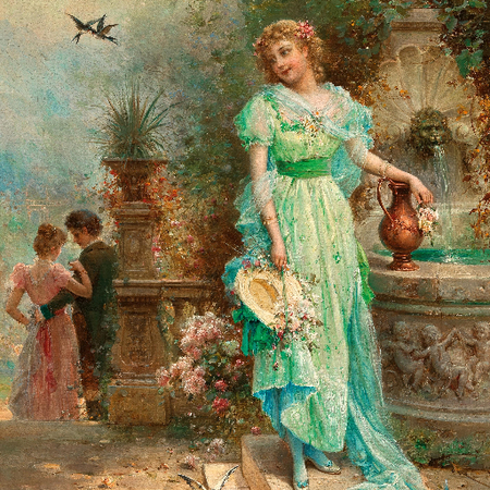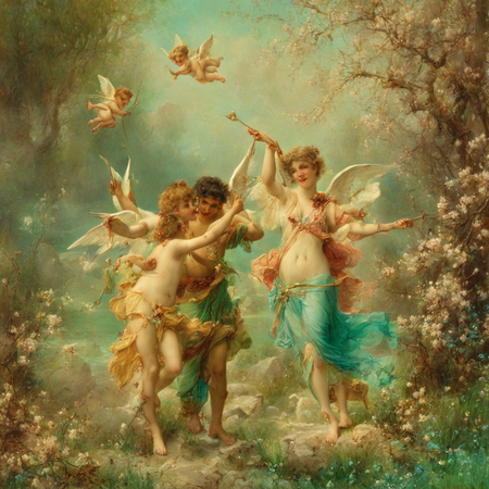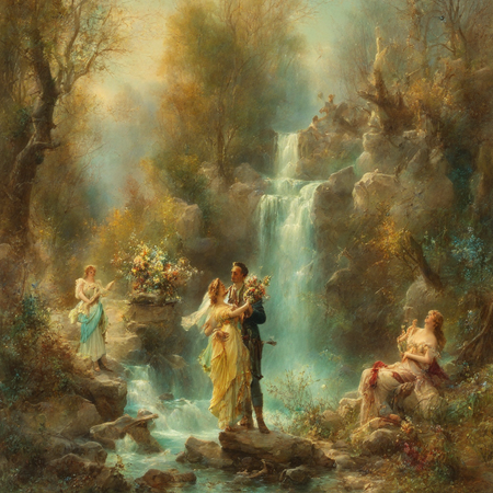 1. painting by Hans Zatzka, a couple standing near a cascading waterfall, the man offering a bouquet of wildflowers to his beloved, as sunlight filters through the trees 2. painting by Hans Zatzka, a winged Cupid aiming his bow at two lovers walking hand in hand through a blossoming cherry orchard