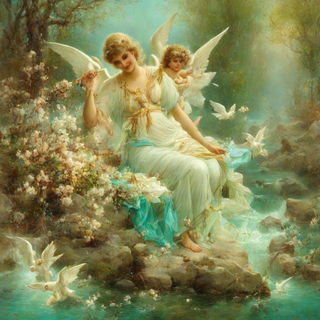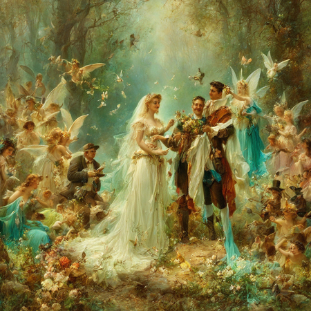 1. painting by Hans Zatzka, beautiful angel with white wings surrounded by blooming trees and a clear stream 2. painting by Hans Zatzka, bride and groom exchanging vows in a forest clearing, surrounded by woodland creatures and fairies scattering flower petals