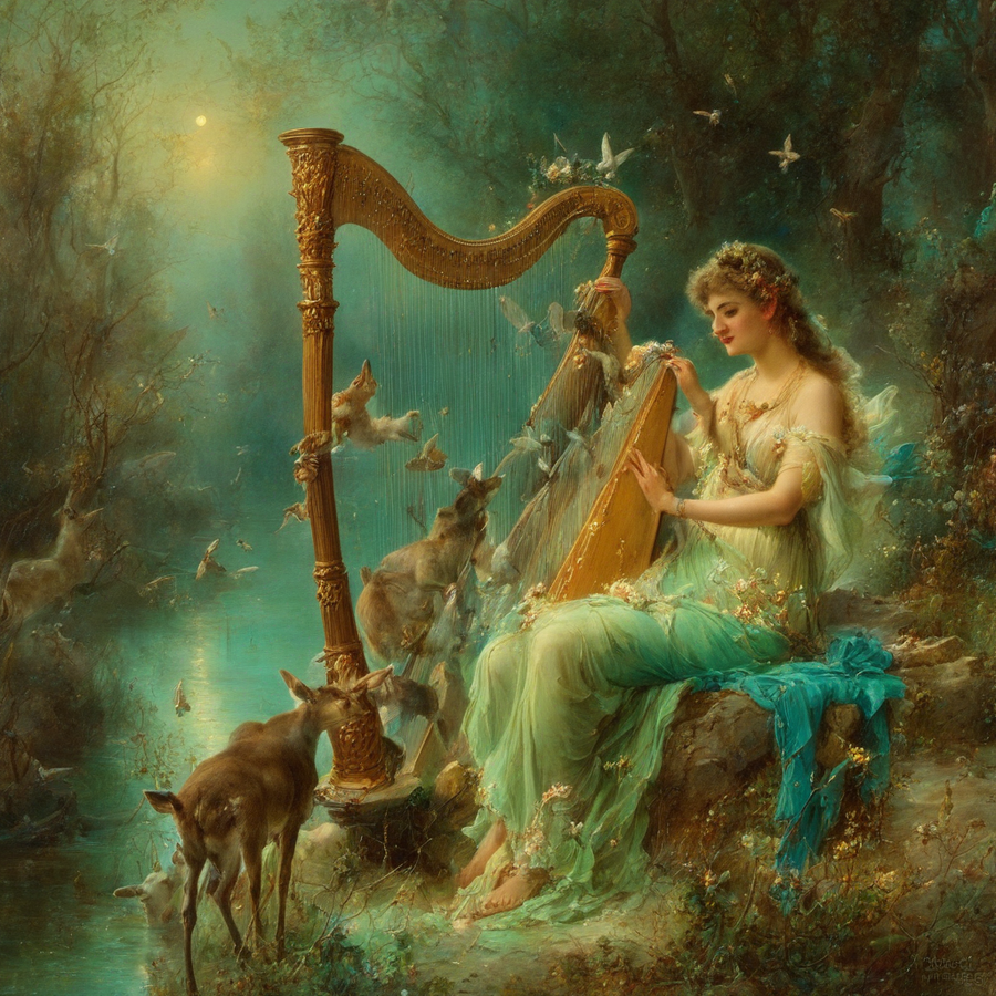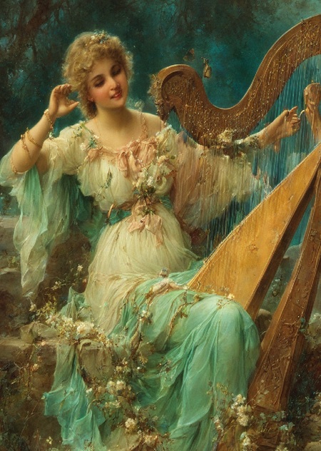 painting by Hans Zatzka, woman playing a harp under the moonlight