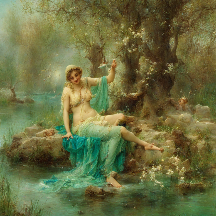 Первая попытка генерации — painting by Hans Zatzka, water nymph emerging from a pond, holding a clay pitcher filled with spring water, as she greets a traveler resting beneath a willow tree
