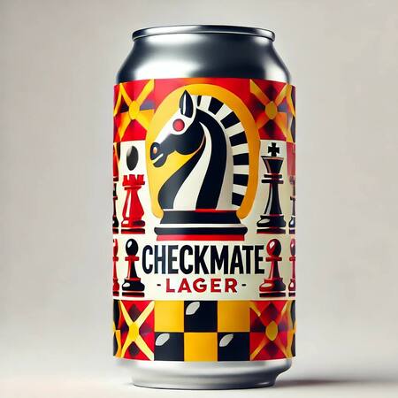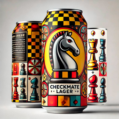 A beer can with a smooth metallic finish on a white background. The label has a bright background in shades of red and yellow, reminiscent of a chessboard. In the center is a stylized chess knight in bold, black and white colors, representing the classic chess piece. Above the knight is the name of the beer «Checkmate Lager» written in a playful, bold font. Around the knight are colorful chess pieces such as pawns and rooks in a dynamic arrangement that creates a sense of movement, as if they are involved in a lively game. To add an extra touch, there may be small icons of chess clocks and scoring sheets around the edges of the label, highlighting the strategic nature of the game. The overall design is eye-catching and conveys the spirit of chess in a fun and accessible way.