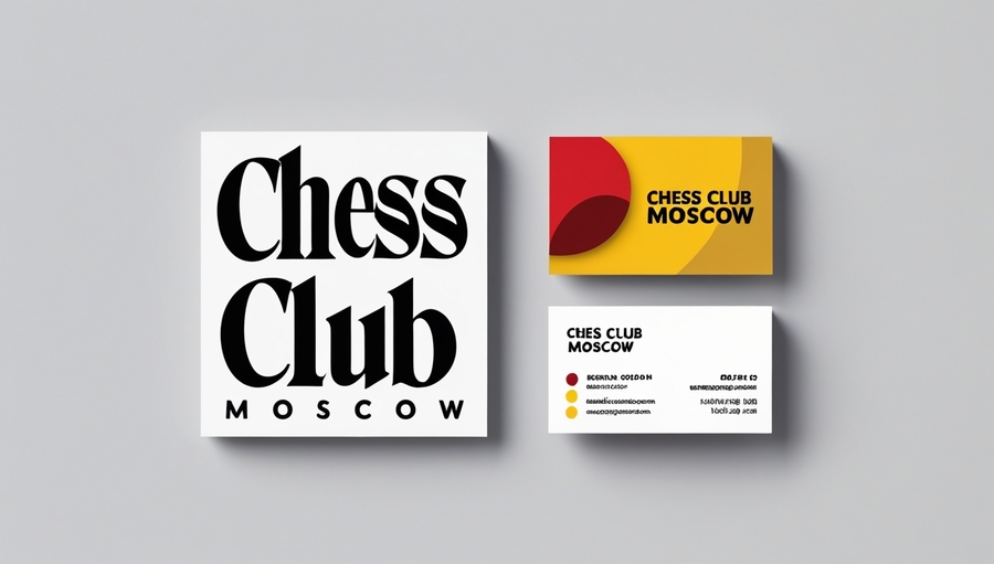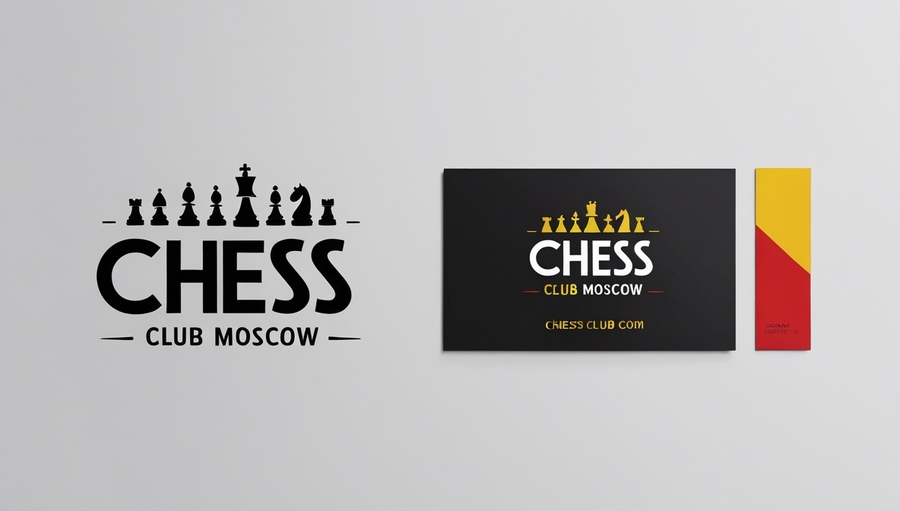 Logo: Design a minimalist logo for «Chess Club Moscow» using expressive typography in black, referencing fashionable chess. Create a separate business card with the addition of yellow and red colors.
