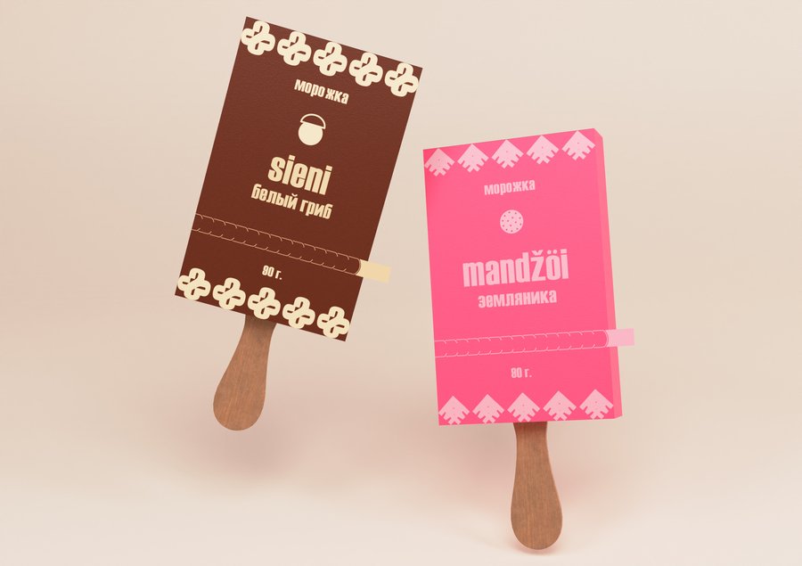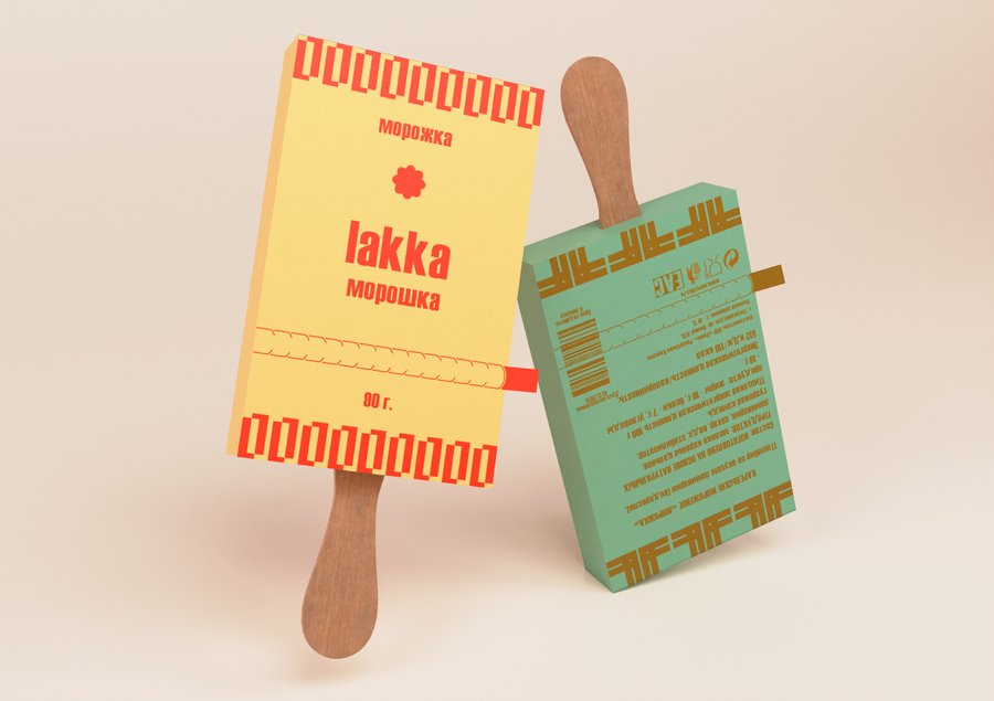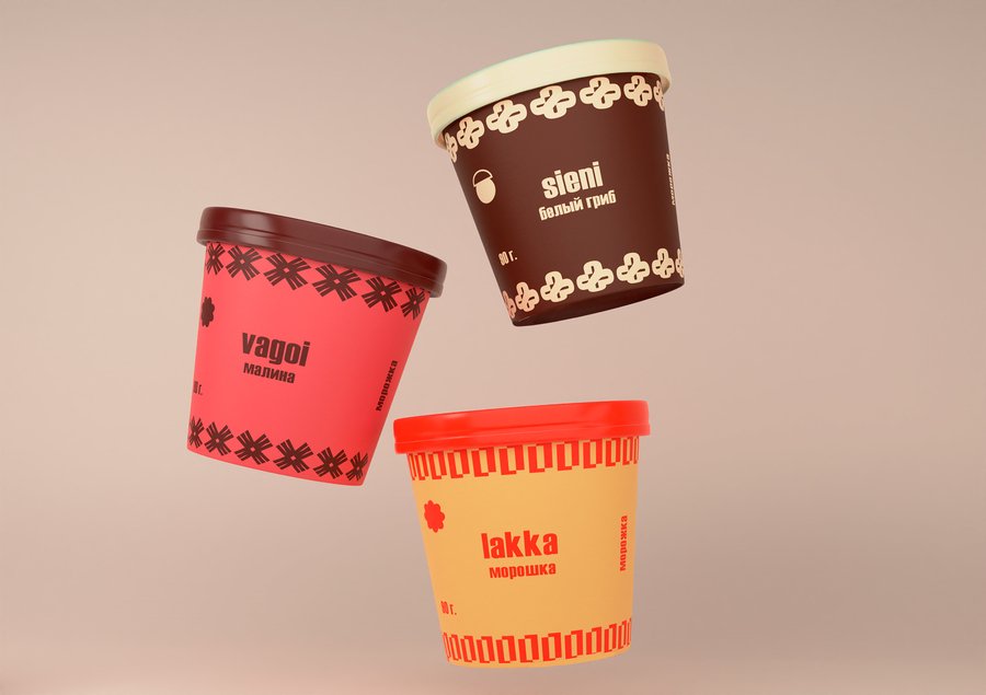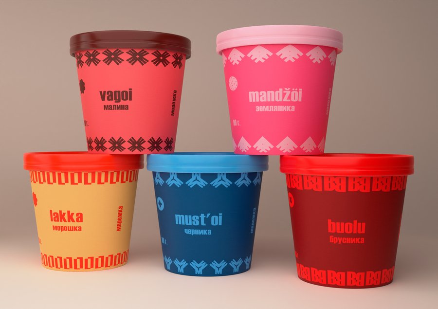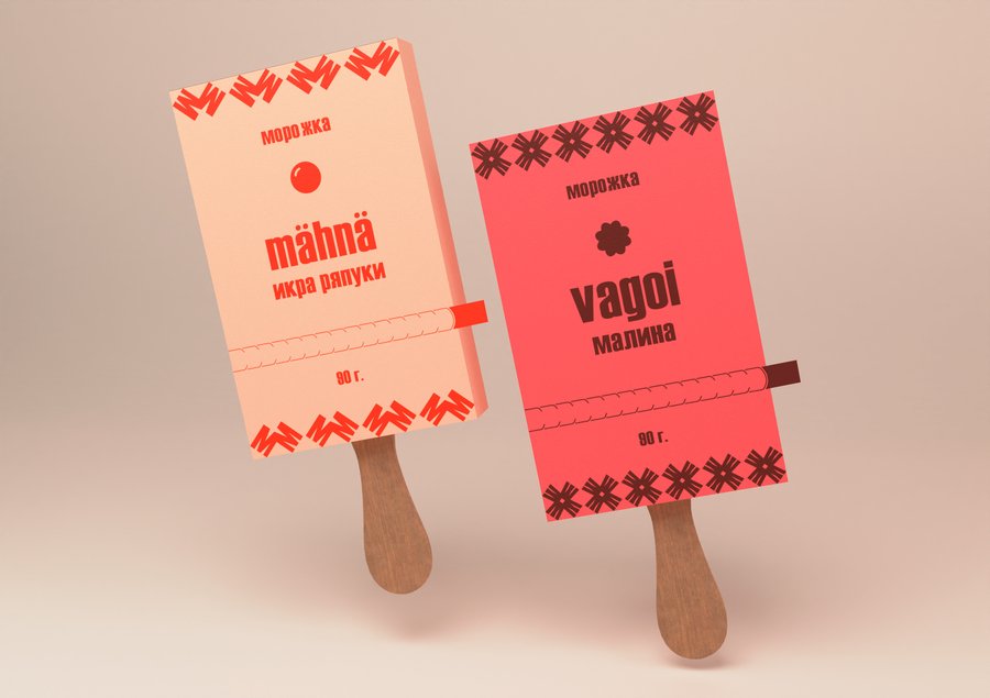 A mesmerizing hyper-realistic photograph of the sleek modern ice cream packaging for the brand «MOROZHKA», a unique original ice cream that is made exclusively from natural berries of different variet