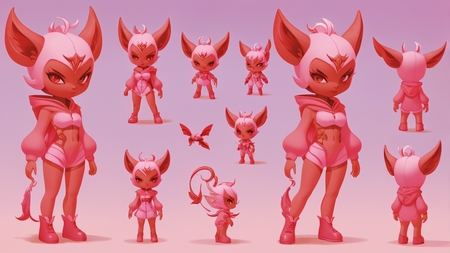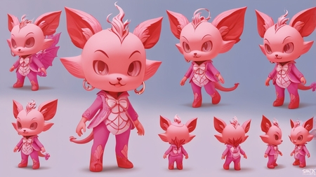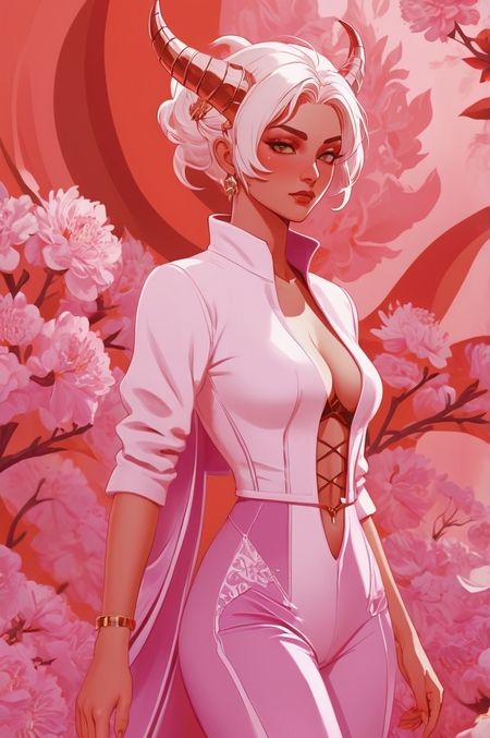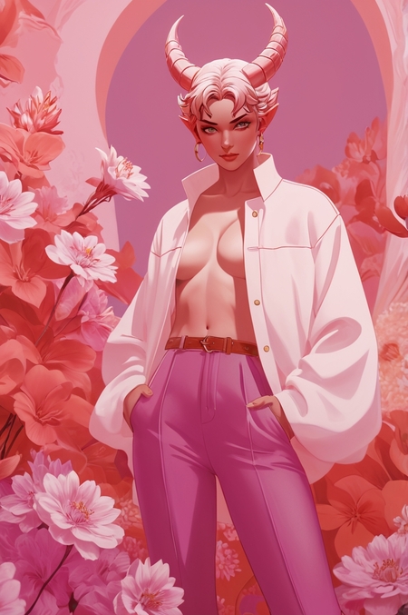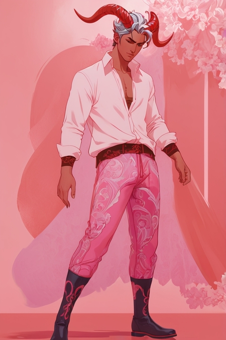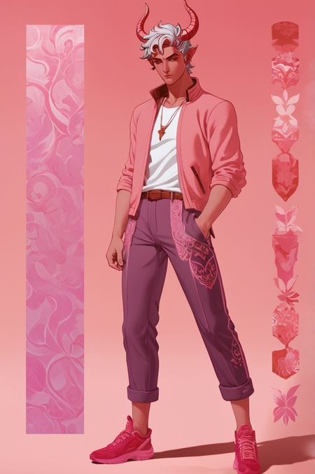 guy looks standing kneeling holding his hand by the elbow with red skin horns and pink-white hair, in bright pink pants with patterns, on a pink background