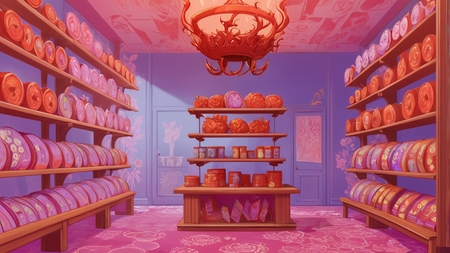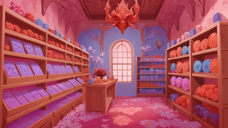 demonic game store with flowers with shelves for board games and shelves with game discs without people