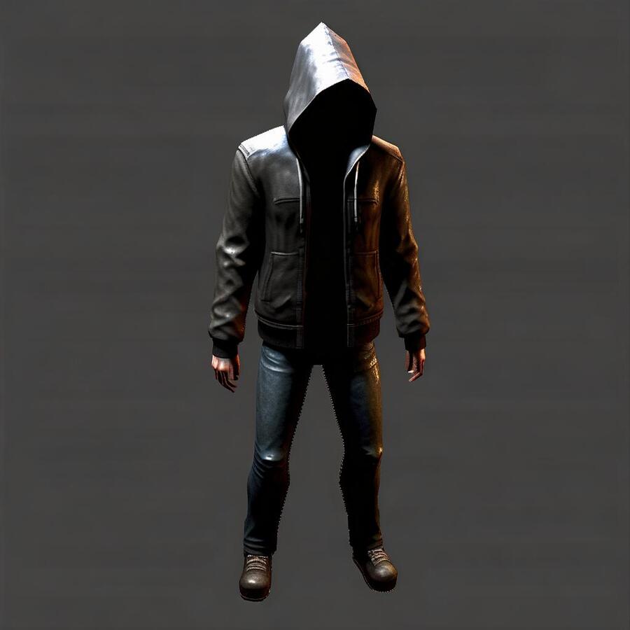 Промт - Playstation 1 style, Silent Hill 1 style, retro 3D very low polygonality, realistic but pixelated textures reflecting the gaming limitations of the era. Horror game main character concept. Grown up male human full-length, black hoodie, black leather jacket, grey jeans. There is a hood on the head, with a cloth mask covering the lower part of the face.