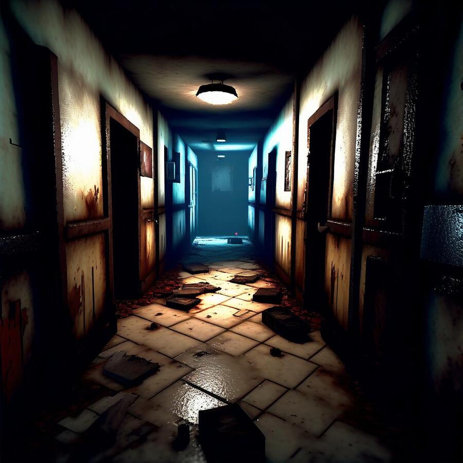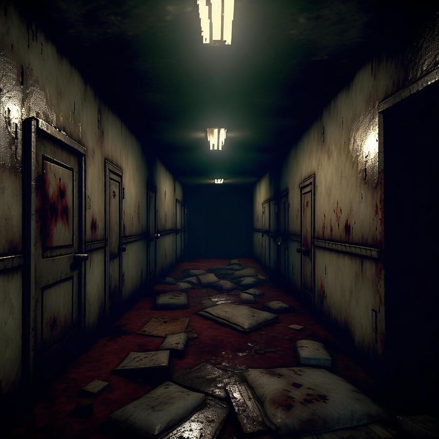 Промт - Playstation 1 style, retro 3D very low polygonality, realistic but pixelated textures reflecting the gaming limitations of the era. Horror game location concept. A long corridor of an old basement, many dilapidated iron doors, dirty mattresses and rags on the floor, a few light bulbs burning dimly.