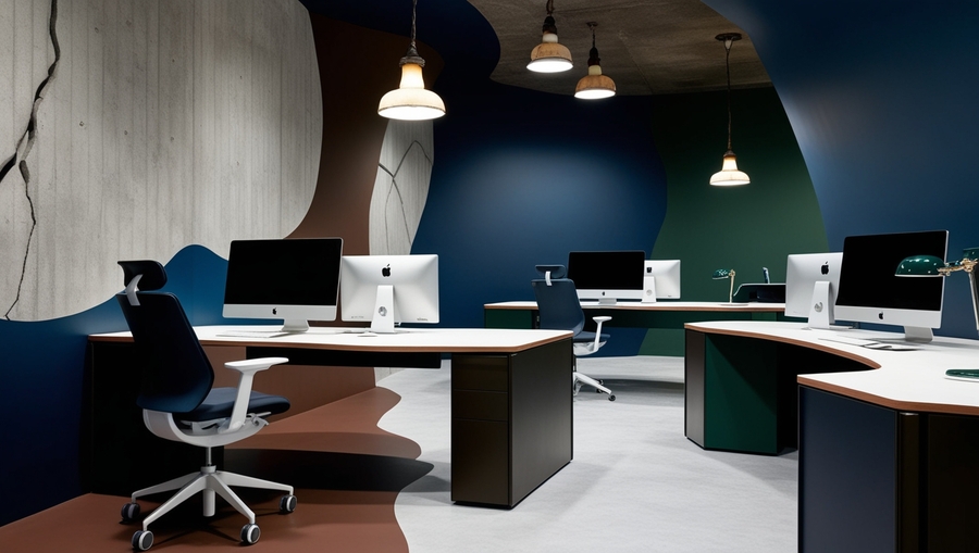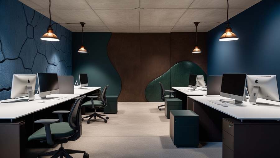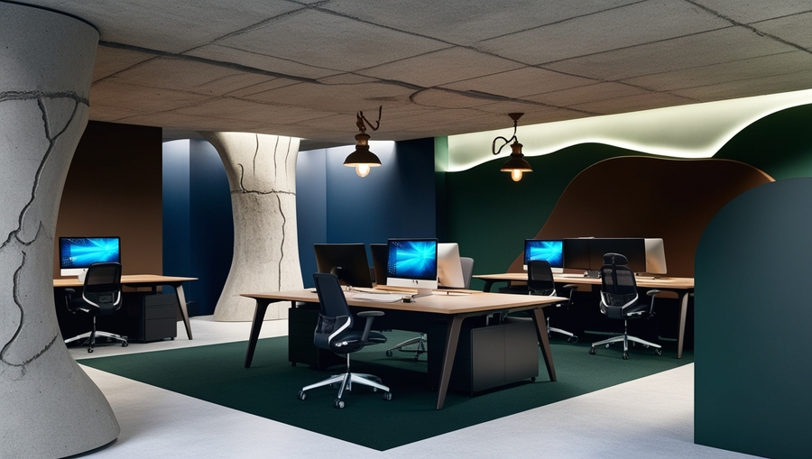Промт - Office space, several modern ergonomic desks with modern computers on them. Dark blue, dark brown and dark green colors. Concrete texture on the walls and floor. Organic shapes. In some places the walls have the illusion of cracks. Old-fashioned lamps on the ceiling