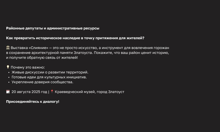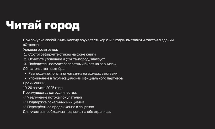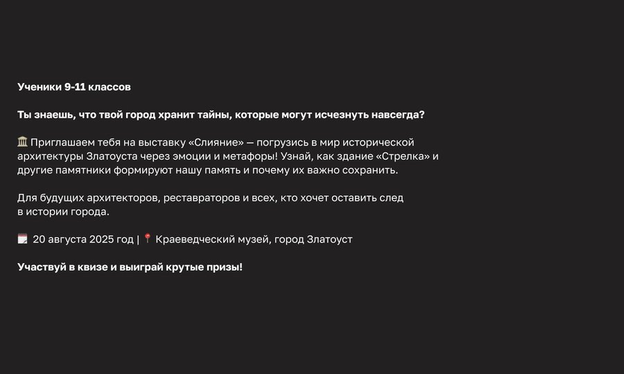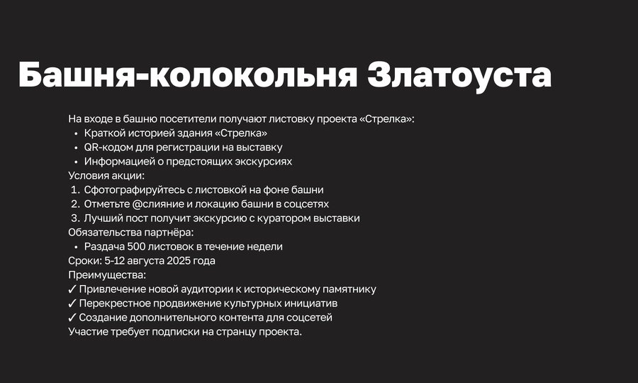 Художественный проект, раскрывающий эмоциональную связь между жителями и архитектурным наследием Златоуста. Через серию фотографий и инсталляций выставка расскажет историю здания «Стрелка» и других памятников города, находящихся под угрозой исчезновения.