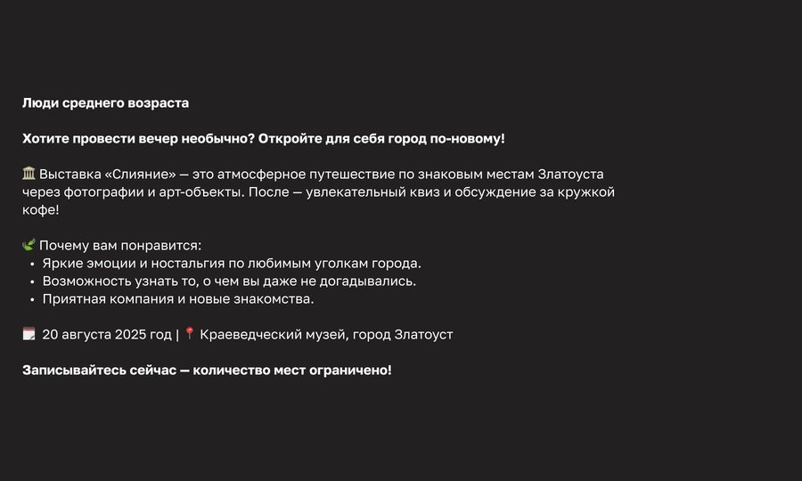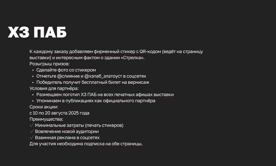 3. Интернет Городской портал «Златоуст.ру»: Анонс мероприятия (перепечатка пресс-релиза) 1-2 тыс. просмотров Паблик «Подслушано Златоуст»: Пост с приглашением (если договоримся бесплатно) 5-7 тыс. показов
