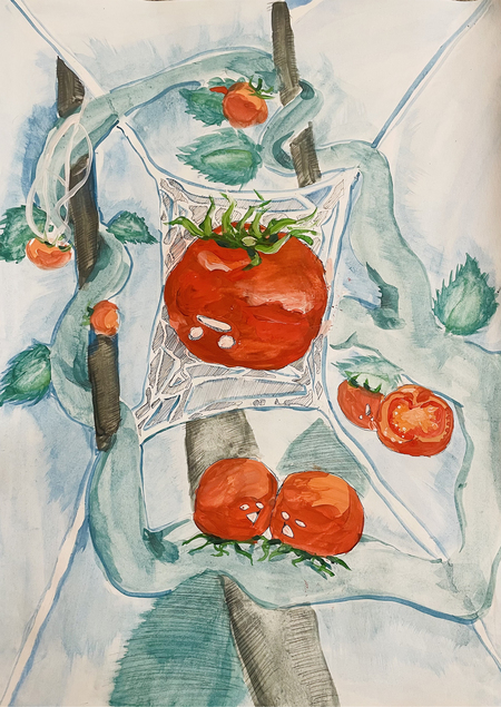 Моя тема — сочные монстры. Я создал несколько монстров и сочетал их с овощами, фруктами или грибами. Это выглядит мило и вкусно. Я использовала контрастные цвета, чтобы они выглядели более эффектно. История — это некоторые вещи, которые происходят в их повседневной жизни.
