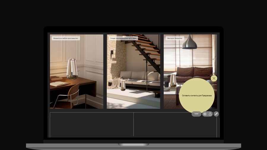 Для разработки визуализации пространства и усиления промтов подробностями использовалась редактура ChatGPT. Шоурум расширяет изначальную моно-концепцию лампы и превращает визионерский стартап в будущий бренд света с большим будущим.