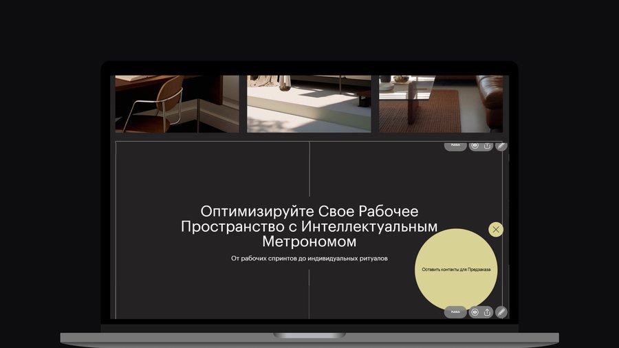 «Для Rhythmic можно выбрать мягкие, спокойные оттенки, ассоциирующиеся с сосредоточенностью и комфортом — теплый серый, пыльный зеленый и бежевый, которые создают ощущение уюта и помогают погружаться в работу. Яркие акценты, например, насыщенный синий или глубокий терракотовый, могут служить визуальными точками концентрации, подчеркивая моменты фокуса. В дизайне можно задействовать плавные линии и простые формы, которые будут символизировать стабильность и равновесие. Такой стиль передает идею о том, что Rhythmic — это не просто устройства, а ваш помощник в создании гармоничного рабочего пространства, где каждый элемент работает на вашу продуктивность и комфорт.»
