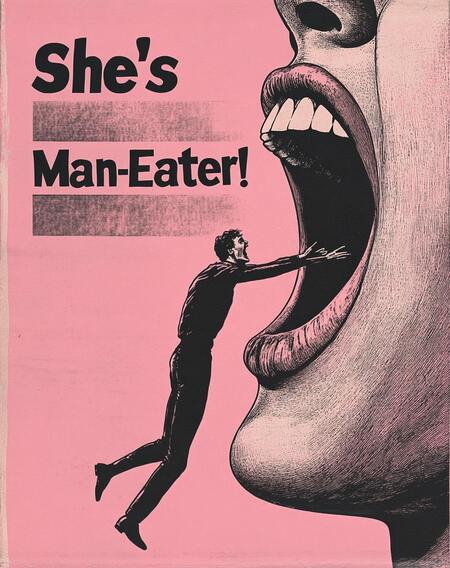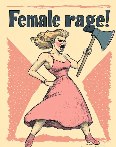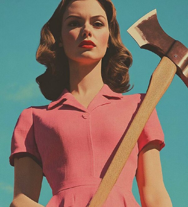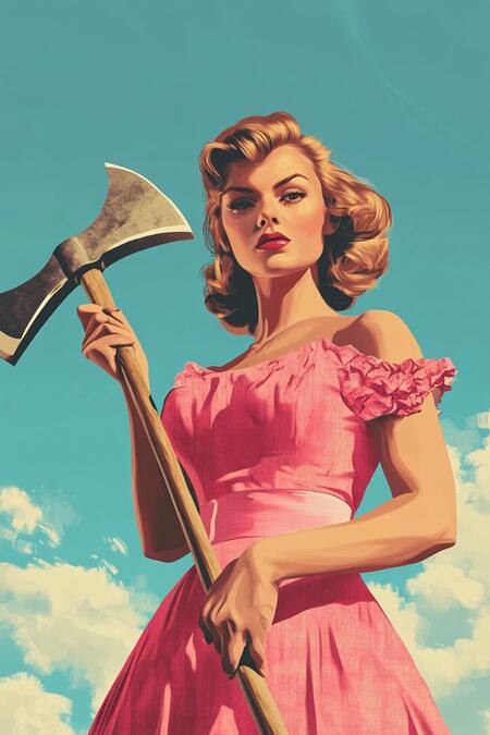 Ресурс — https://www.midjourney.com/ Promts: - Vintage magazine cover, poster with vintage woman as the main character. She is holding an axe and wearing a pink dress with the title «Female rage!», illustration in the style of David Shrigley. - Vintage magazine cover, a man being stretched out of a giant woman’s mouth with the title «She’s a Man-Eater!», illustration in the style of David Shrigley. - A movie poster with vintage woman as the main character. She is holding an axe and wearing a pink dress. The background is a blue sky. The style should be vintage-inspired, reminiscent of classic cinema. The color tones should be vintage, with a hyper-realistic, cinematic photographic style illustration in the style of David Shrigley