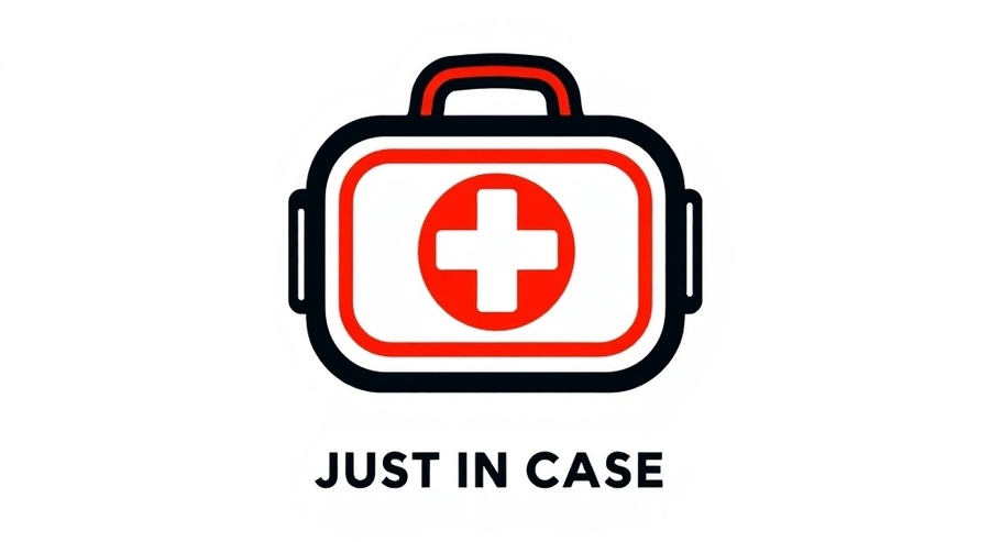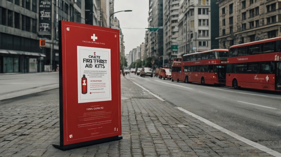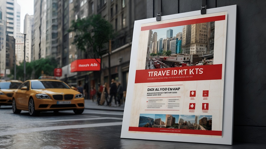 Промпт: create a photo mockup of poster in the environment. the poster is for brand of travel first aid kits. the design should be minimalistic and comedic. the colors are white, black and red. The name on the poster should be JUST IN CASE. The background of photo is urban city