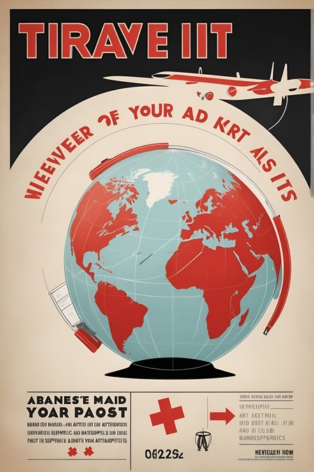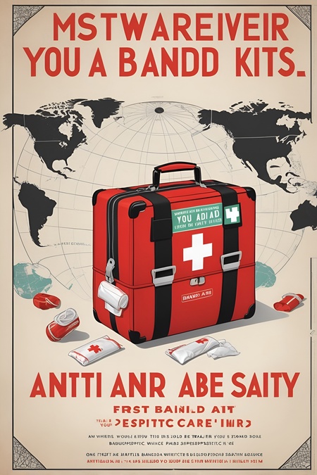 Промпт для Leonardo Ai: create a poster for brand of travel first aid kits. the design should be minimalistic and comedic. the colors are white, black and red. The poster features a globe made of first aid supplies (bandages, antiseptics) with travelers around it. The poster says something similar to «Wherever you go, safety should be your second nature!»