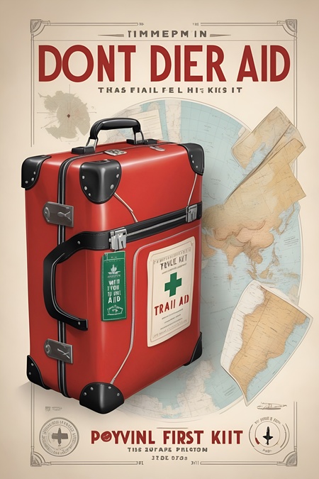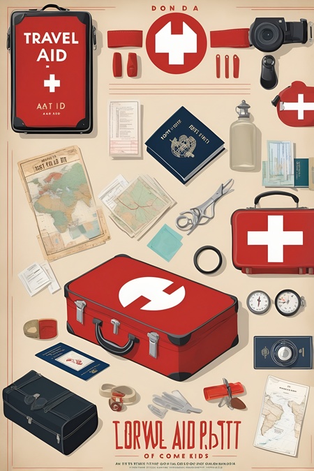 Промпт: create a poster for brand of travel first aid kits. the design should be minimalistic and comedic. the colors are white, black and red. The poster features A travel kit surrounded by exotic items (map, passport, camera). The poster says something similar to «Don’t hit the road without your trusty first aid companion!»